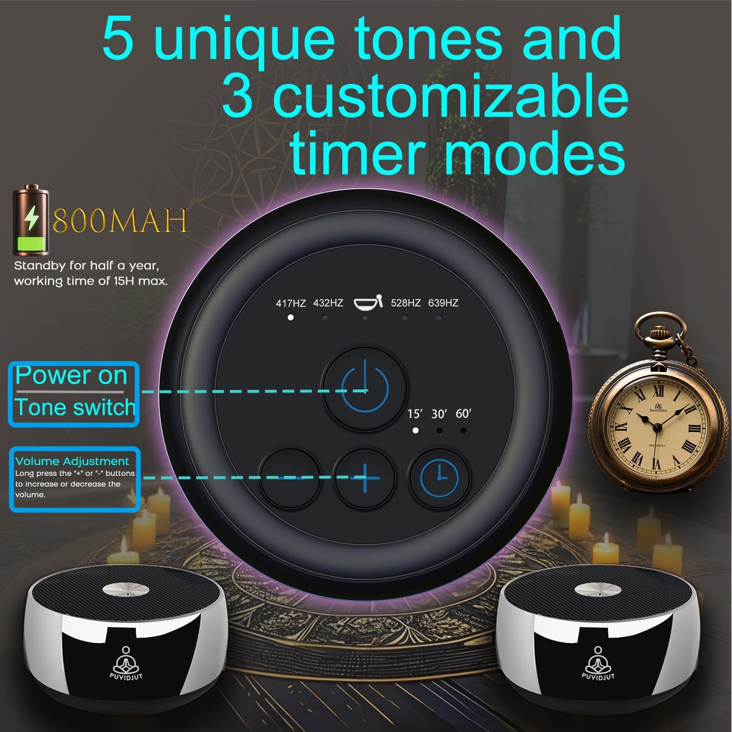 5 Tones, 3 Timer Modes Optional: One button to control 5 tones of 417Hz, 432Hz, 528Hz, 639Hz and Tibet Singing bowl. One button to control of 3 timers, 15mins, 30mins, 60mins. Defualt starts at 417Hz and power off automatically after 5 mins if no time is set.