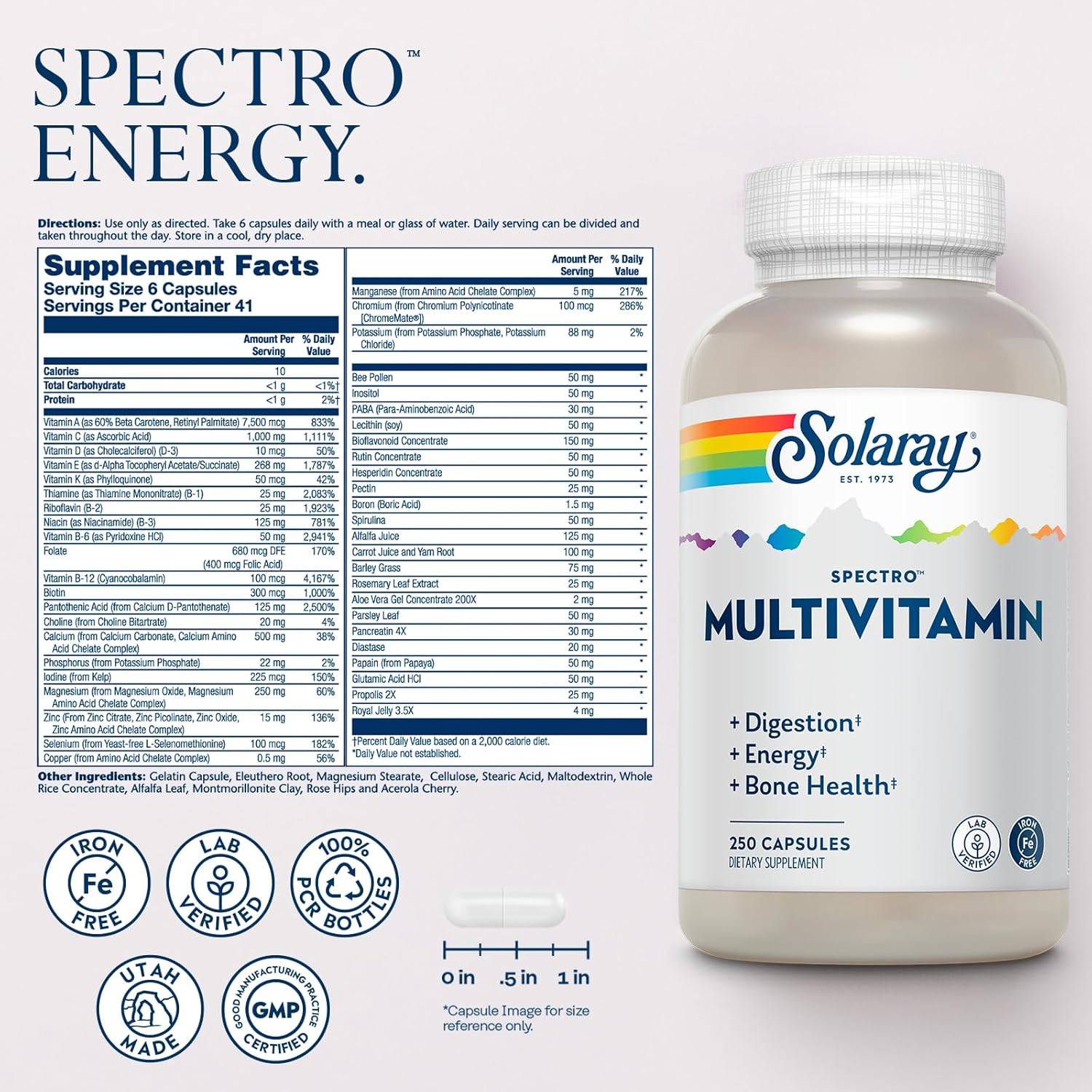 SOLARAY Spectro Multivitamin, Iron Free – Multi Vitamin w/Calcium, Magnesium, Energizing Greens, Digestive Enzymes – Digestion, Cellular Energy, Bone Health, Immune Support, 41 Servings, 250 Capsules