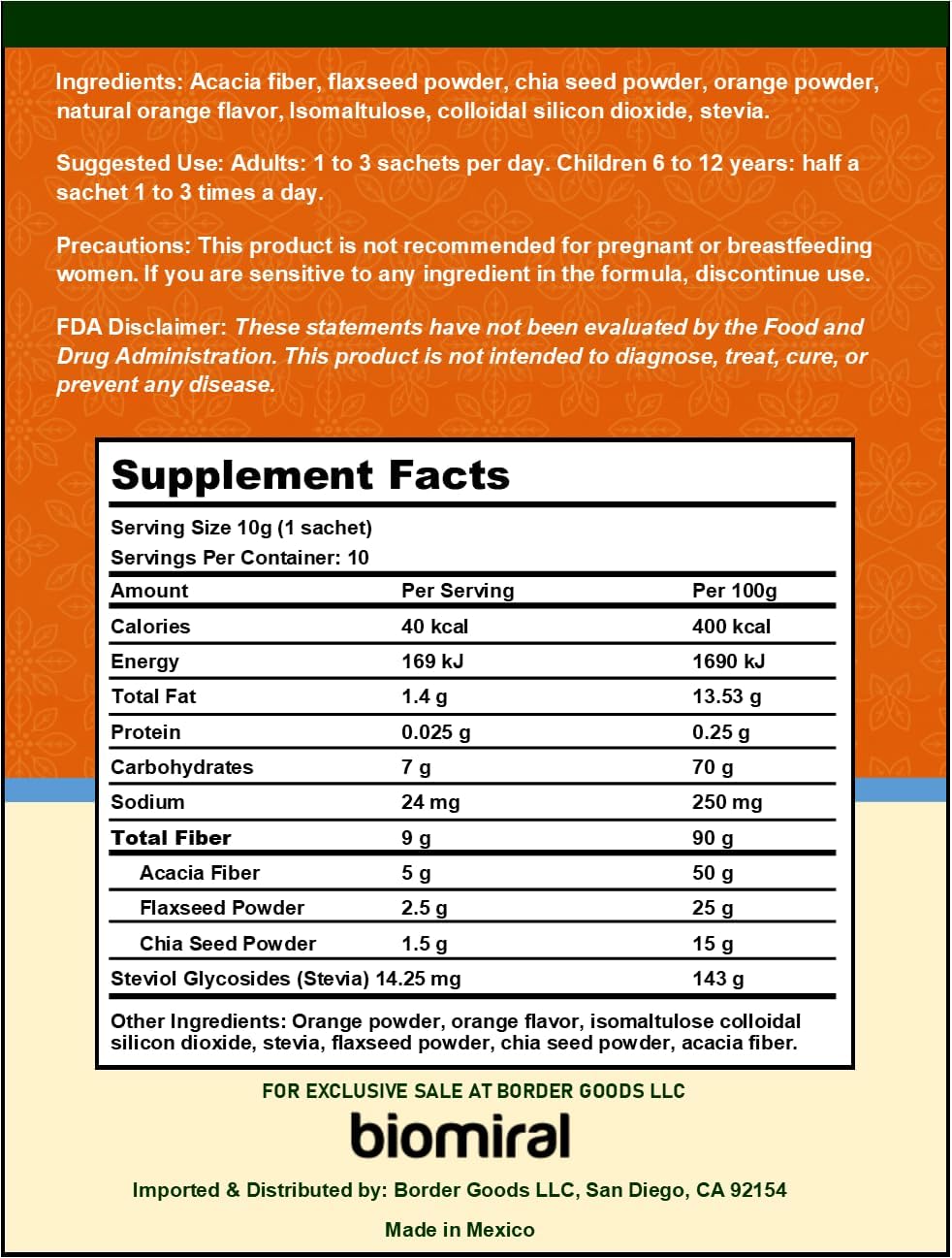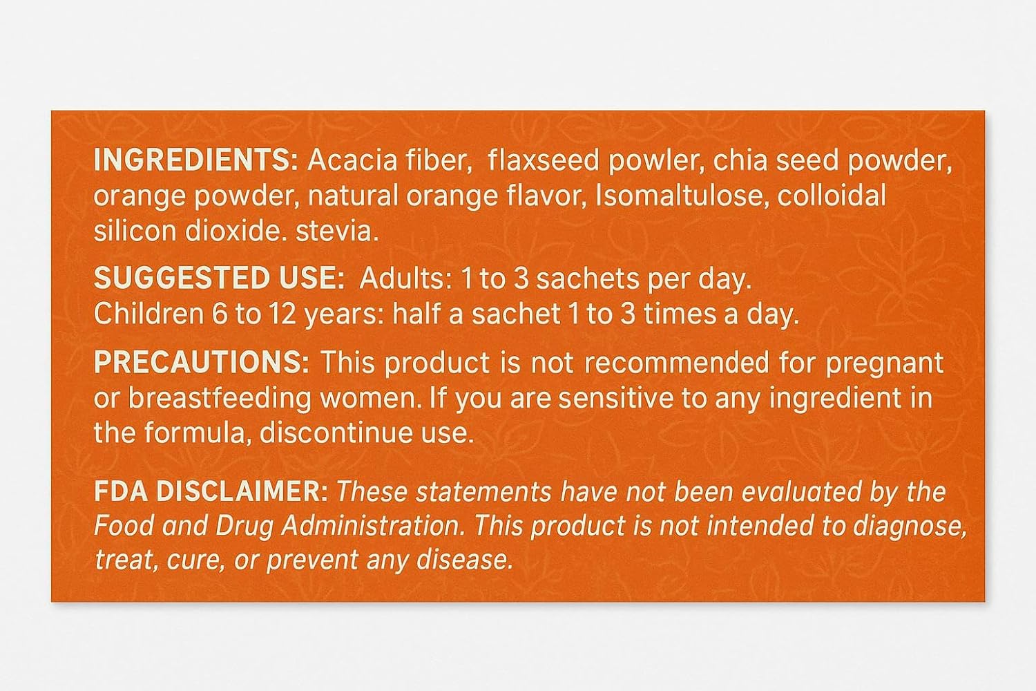 Ingredients: Acacia fiber, flaxseed powder, chia seed powder, orange powder, natural orange flavor, isomaltulose, colloidal silicon dioxide, stevia.