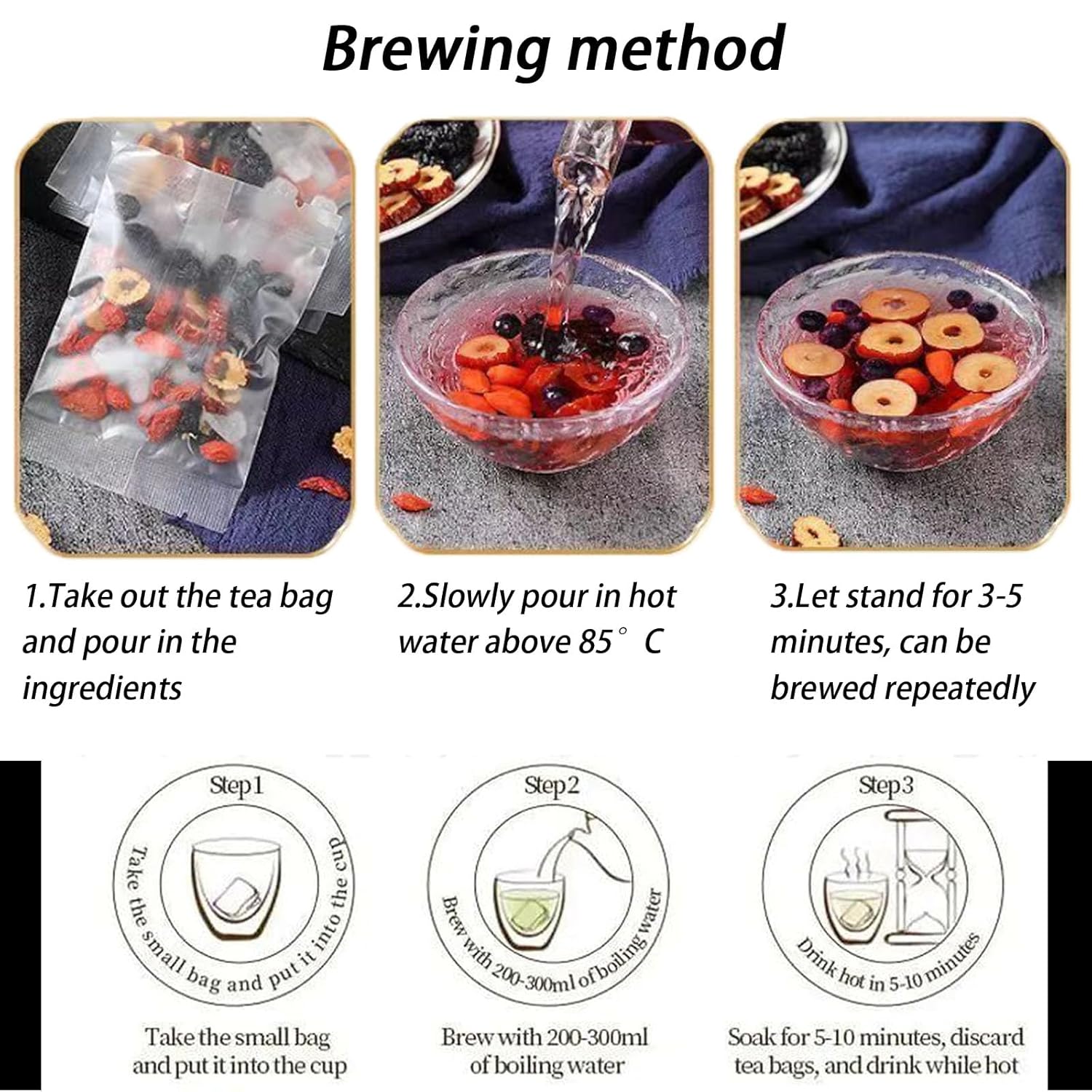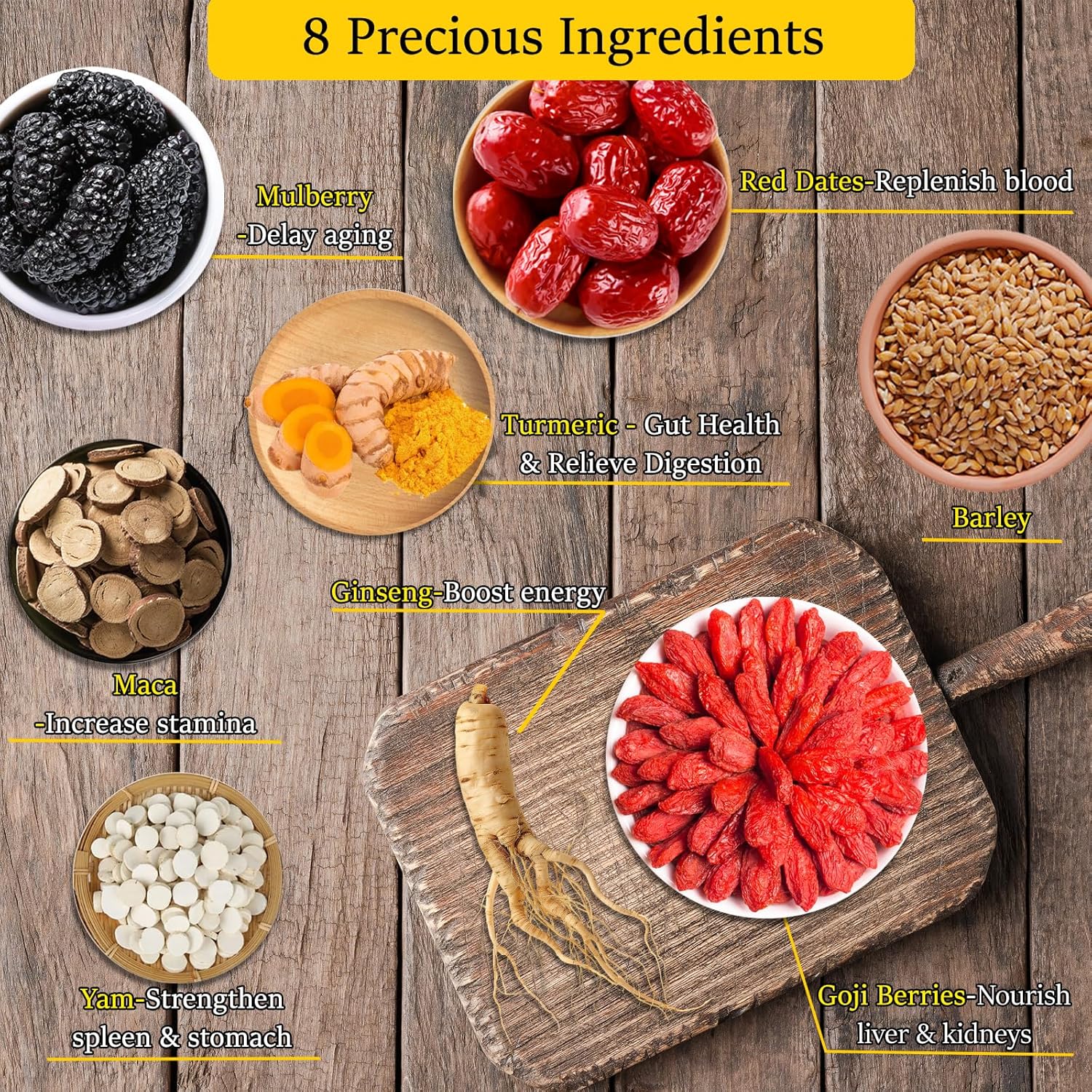 Are they eight natural ingredients? – Our turmeric kidney tea formula ginseng eight treasure tea uses pure natural herbs, hand-planted and collected, no additives, vegan, and strictly selects 8 precious raw materials, including turmeric, ginseng (artificially planted for 5 years or less), wolfberry, maca, red dates, mulberry, barley, yam, and is baked and packaged at low temperature according to the traditional formula, adhering to the principle of letting customers drink with confidence.