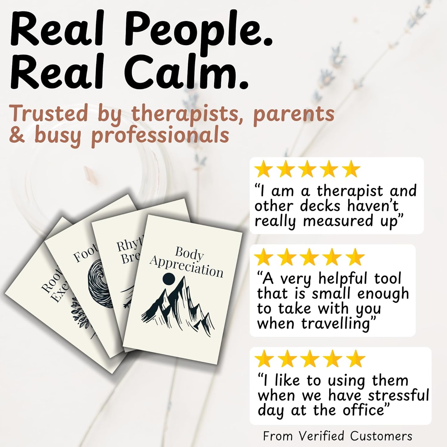 Compact cards in a durable, portable box make it easy to use grounding, movement, and mindfulness exercises at home, work, or wherever stress relief is needed.