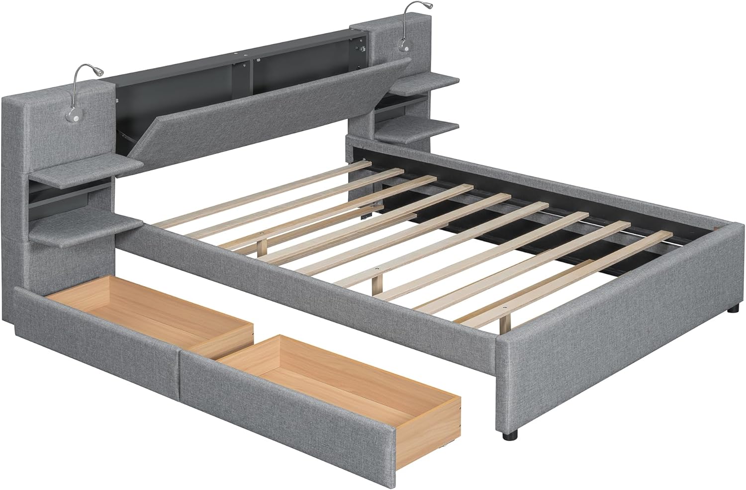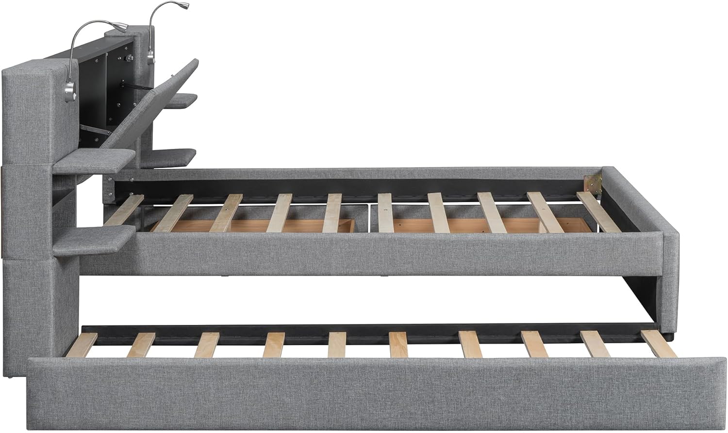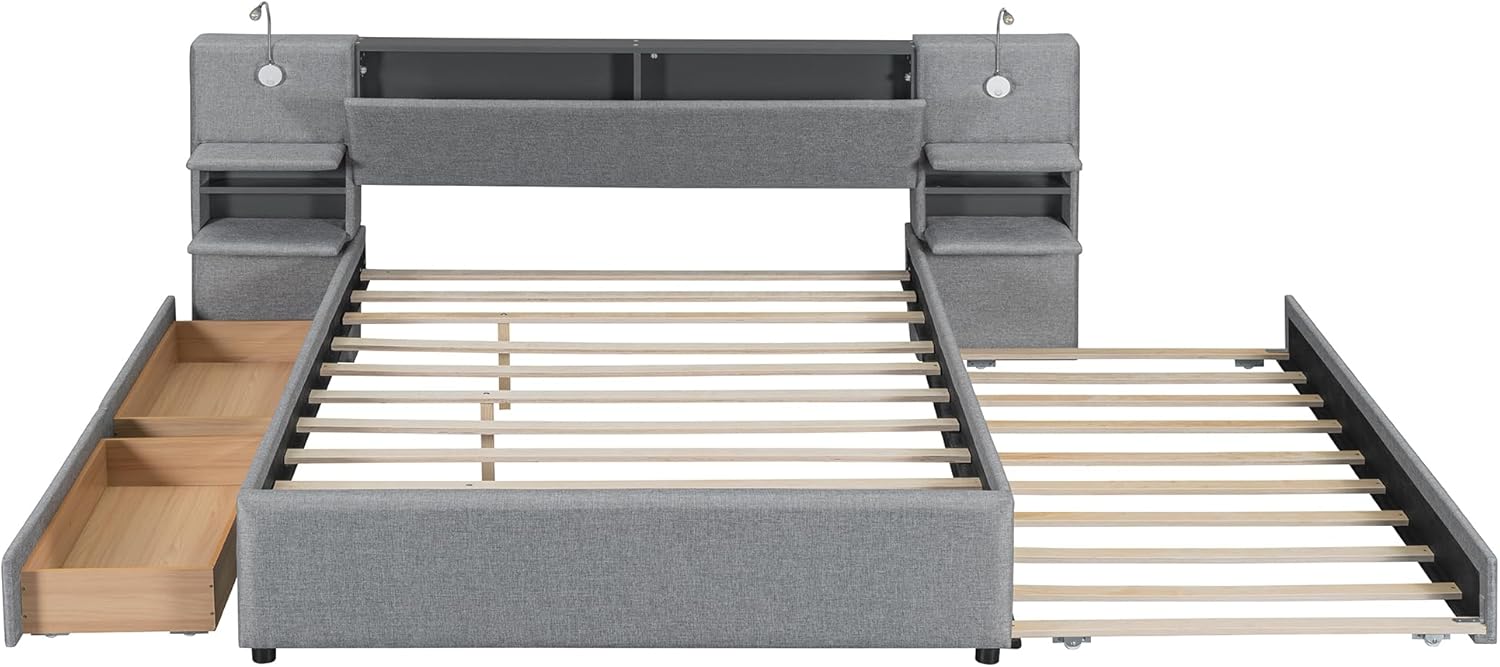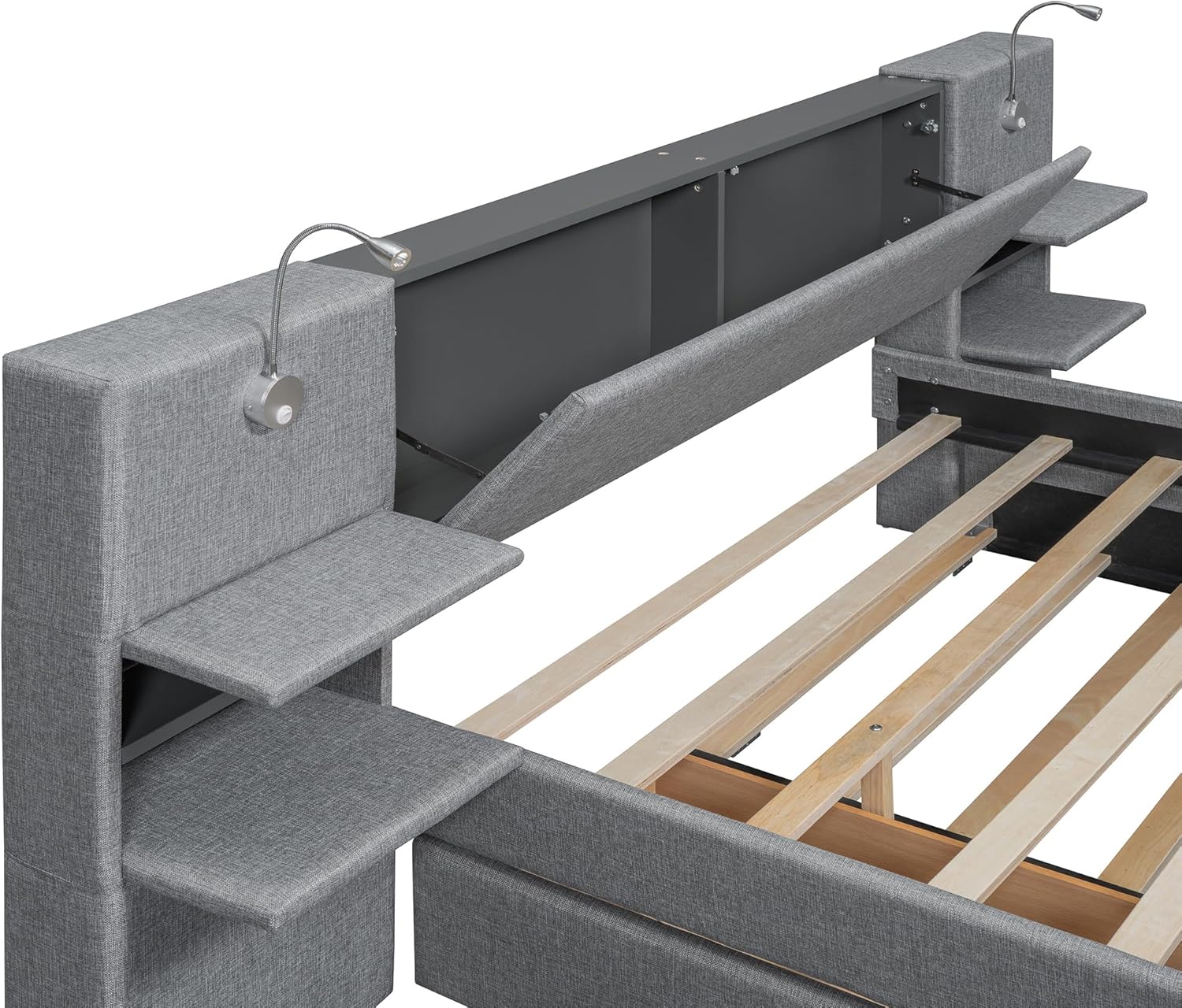 Queen Size Upholstered Platform Bed with Adjustable Integrated Reading Light and Flip Over Storage Headboard, Cushioned Backrest, Drawers, Trundle, and Side Storage Shelves (Gray)