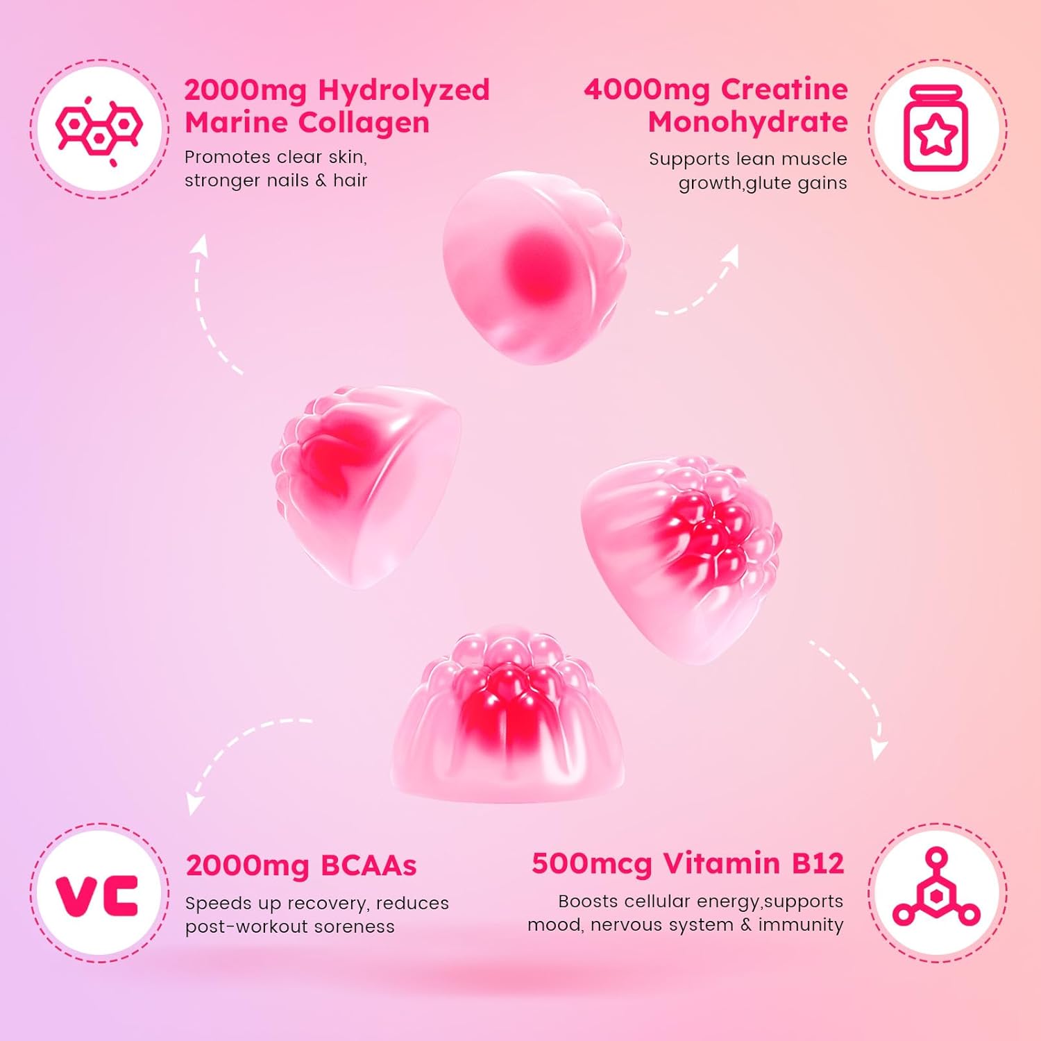 Creatine for Women, Creatine Monohydrate Gummies with Collagen+BCAAs+Hyaluronic Acid+Vitamin C & B12, Supports Lean Muscle, Booty, Energy & Recovery, 120 Sugar-Free Flavored Vegan Gomitas de Creatina