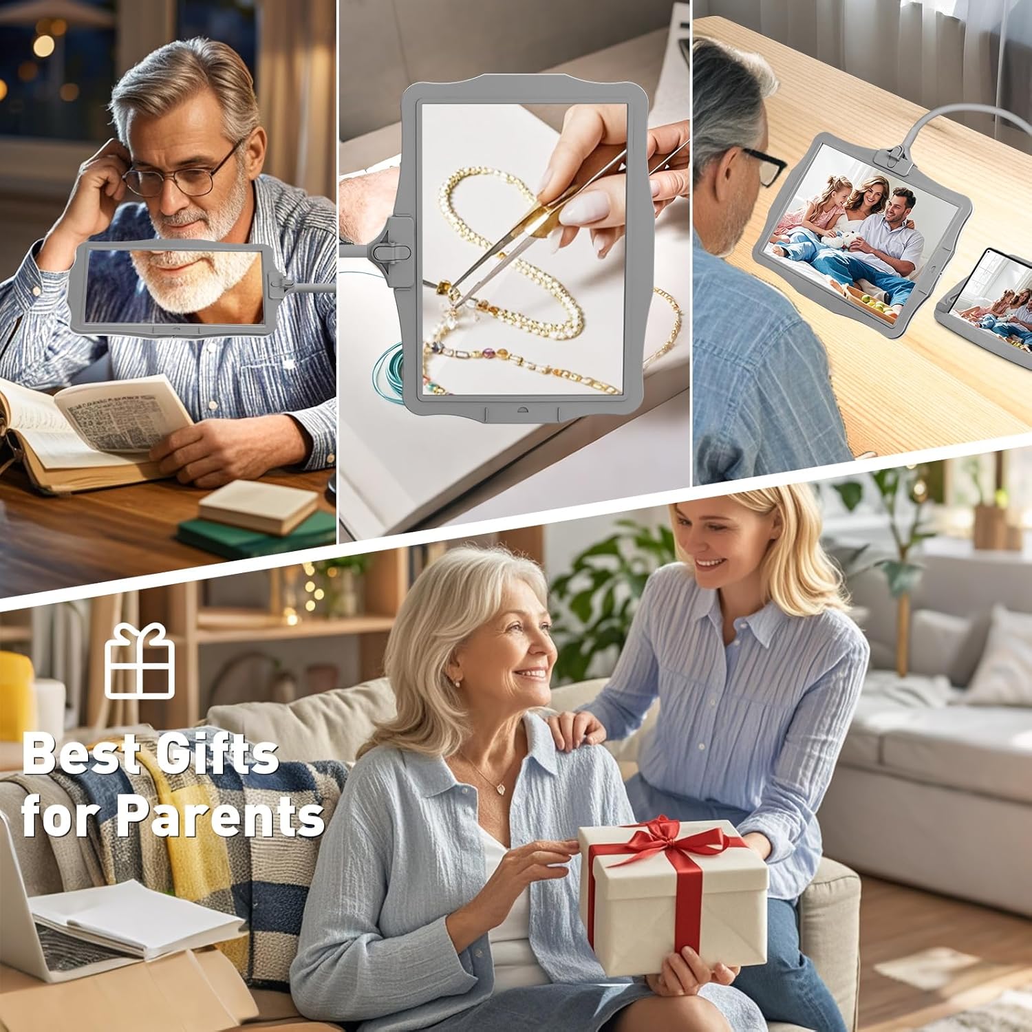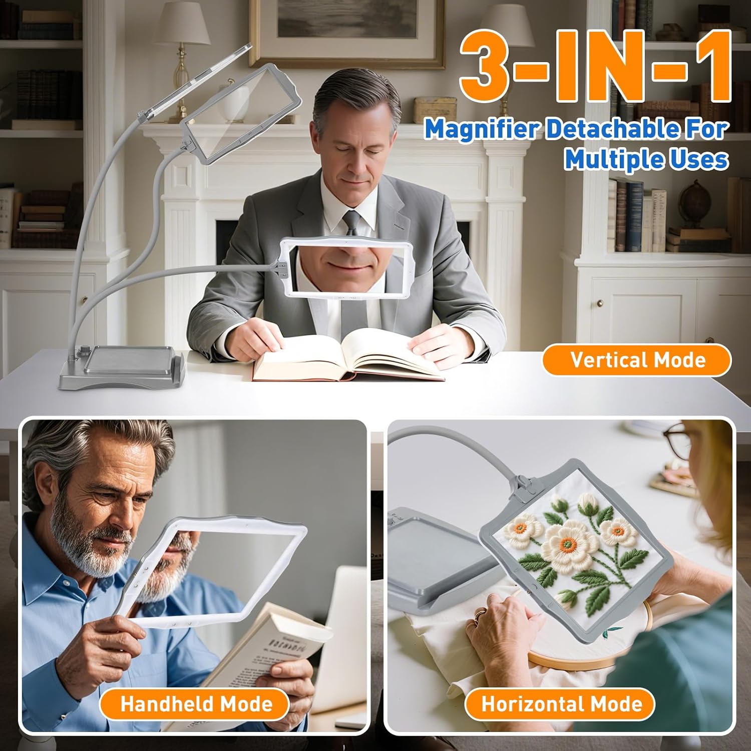 3-IN-1 Multiple Use Modes: This magnifier with light for reading features three configurations, easily switching between desktop and handheld modes. The handheld mode is ideal for those with weak grip strength. The desktop option allows for horizontal and vertical adjustments, while the heavy-duty base ensures stability for focused tasks, freeing your hands for precision work—perfect for magnifying lamp with light for close work