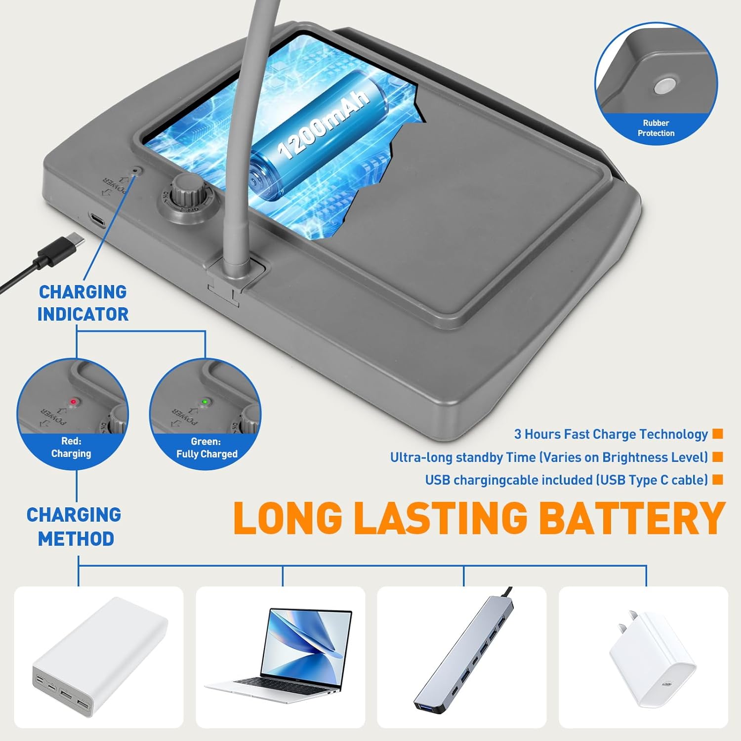Reliable Power Supply and Fast Charging: This standing magnifying glass with light is equipped with a built-in 1200mAh battery to ensure extended use time. No need to replace batteries frequently, eliminating the hassle of constant replacements. With the included Type-C charging cable, 3 hours of fast charging allows you to enjoy long-lasting lighting anytime, anywhere, making it a great choice for a full page magnifying glass experience.