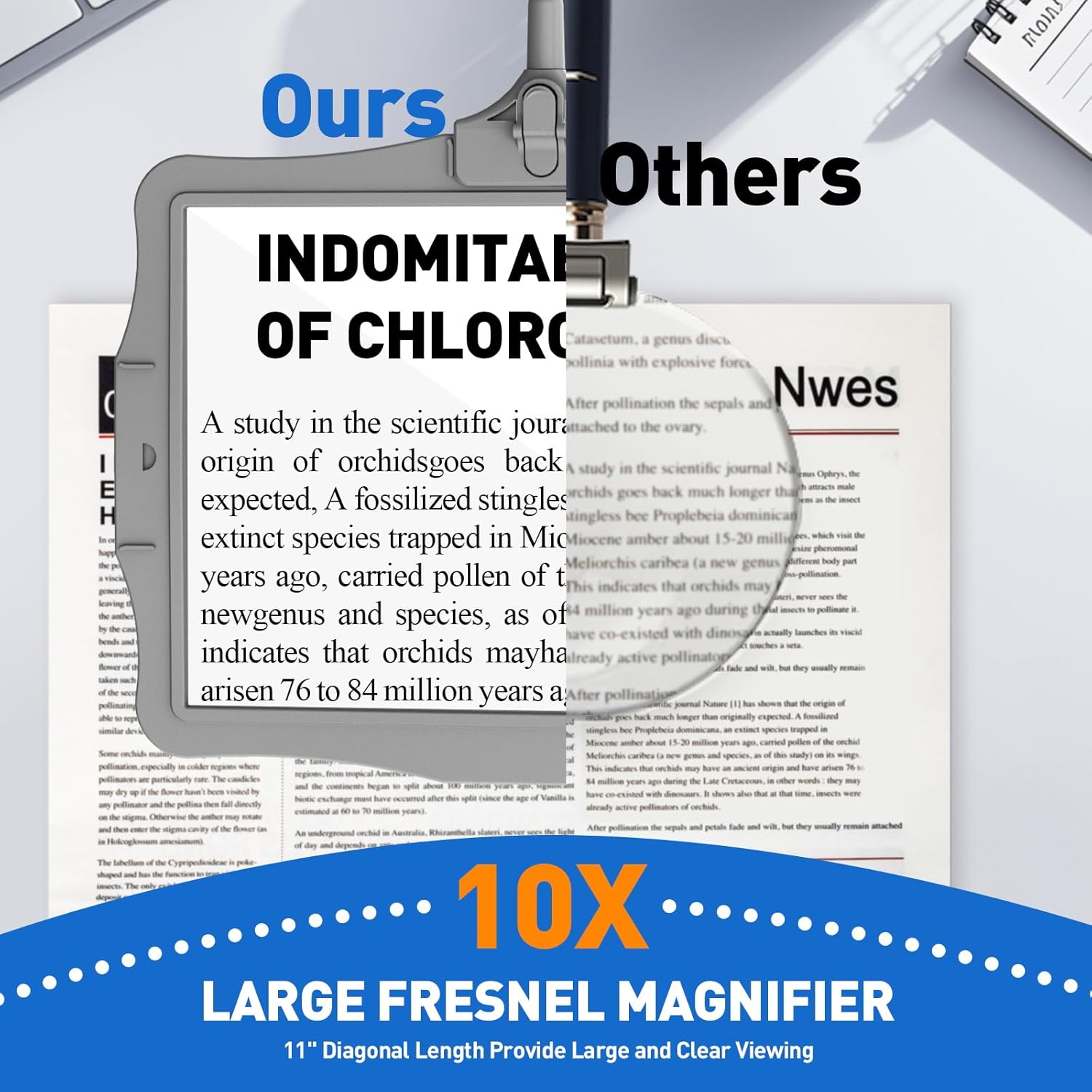 Lightweight acrylic lens magnifies up to10x (1000%)with provides clearer vision undistorted viewprovidedLarge 10.6×7.8″ viewing area without constantrepositioning and minimizes your hand movementtoWeighing only 0.39 pounds, it reduces hand stress while remaining scratch and shatterproof magnifier with light hands free magnifying lamp book magnifier for reading reading magnifiermagnifier with light hands free magnifying lamp book magnifier for reading reading magnifier BATTERY LONG LASTING