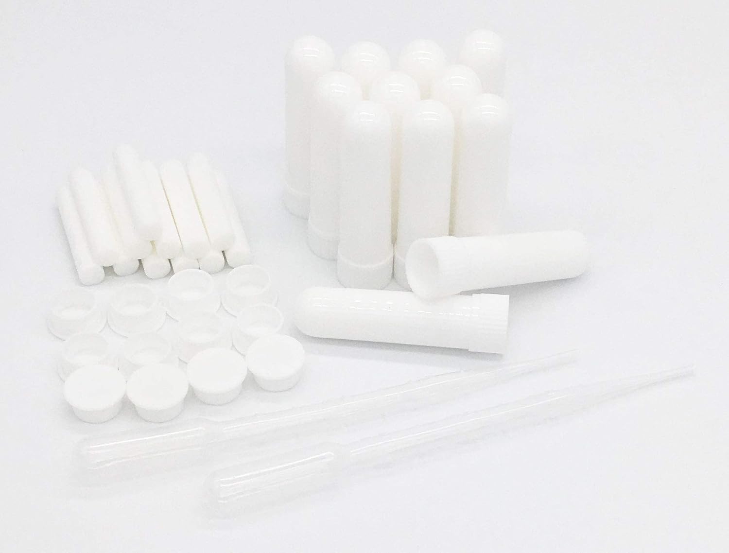 ✔12 plastic nasal inhalers (Including 12 unscented wicks, 12 inhalers, 12 covers, and 12 plugs) and two 3ml polyethylene graduated pipettes included for easy transfer of oils.