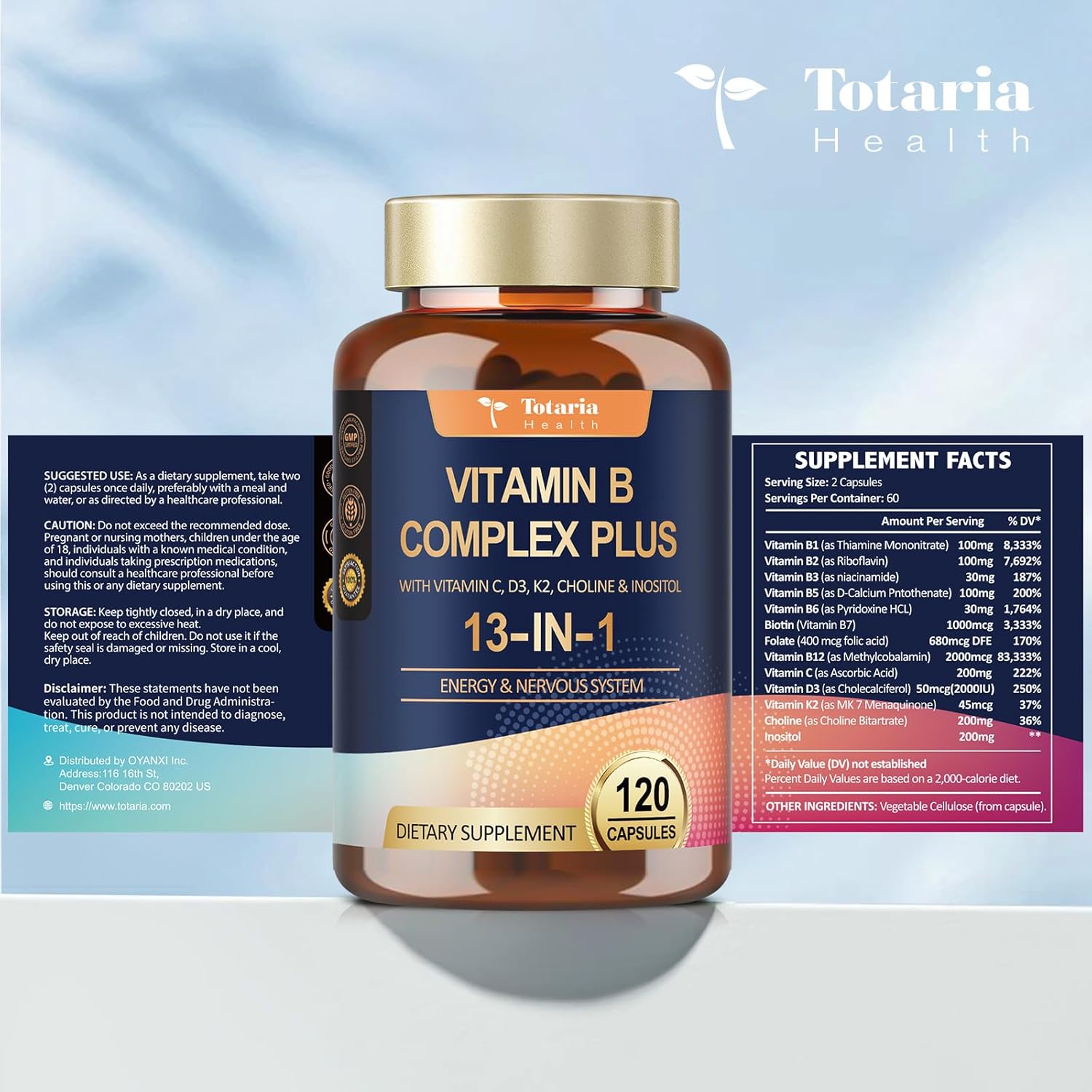 VITAMIN B COMPLEX PLUS: Totaria 13-in-1 Vitamin B Complex, containing Complete B Complex: Vitamin B1, Vitamin B2 (Riboflavin), Vitamin B3 (Niacinamide), Vitamin B4 (Choline), Vitamin B5, Vitamin B6, Vitamin B7 (Biotin), Vitamin B8 (Inositol), Vitamin B9 (Folate), Vitamin B12 and Vitamin C, Vitamin D3, Vitamin K2. Super B complex, 13 kinds of vitamins to satisfy your 13 kinds of nutritional supplements.