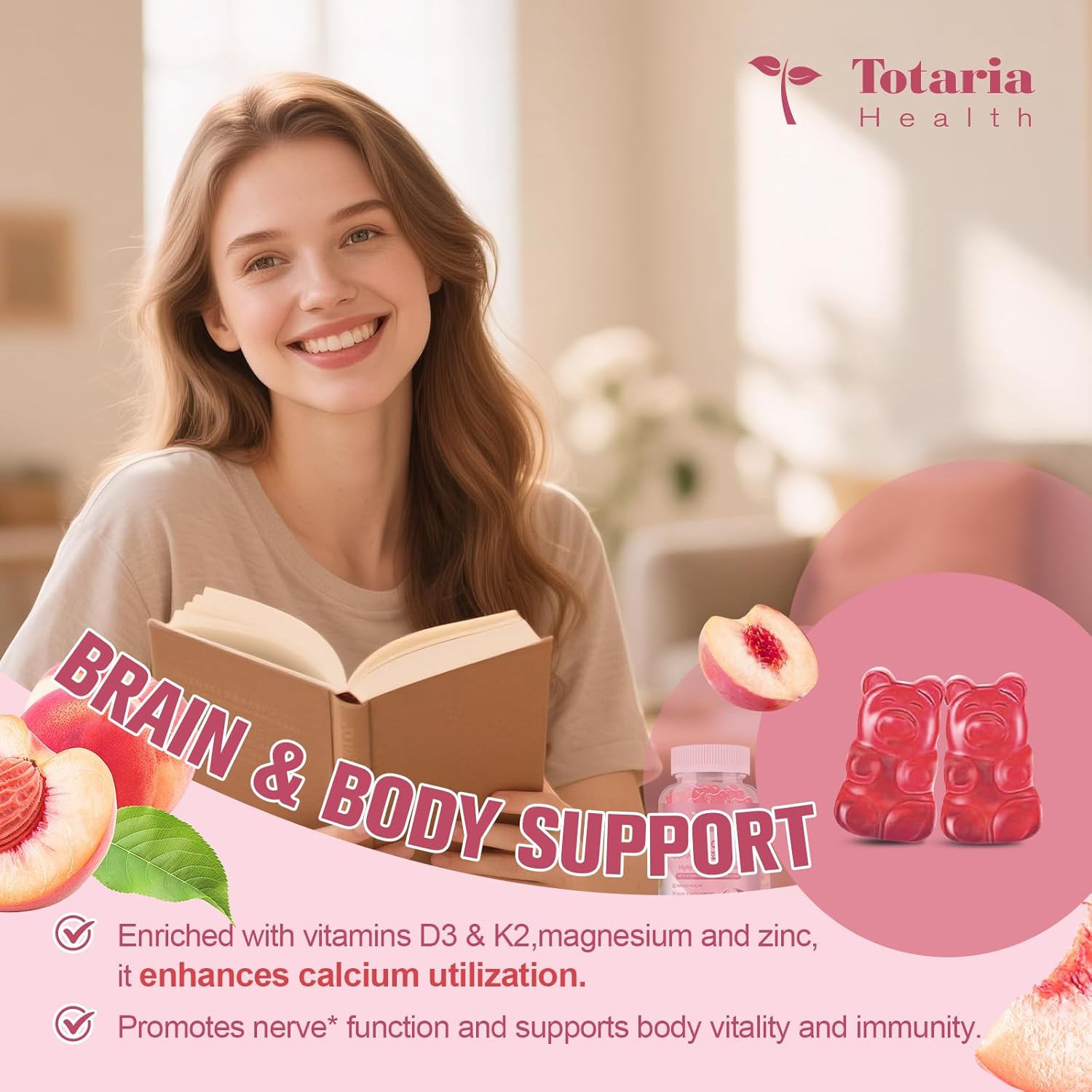 Brain & Body Support – Calcium 1200 mg with Vitamin D3 and K2,Magnesium,Zinc to enhance calcium utilization, promote nerve function and support body vitality and immunity. Meeting your daily calcium needs is as simple as taking 2 gummies a day to enhance your overall health!