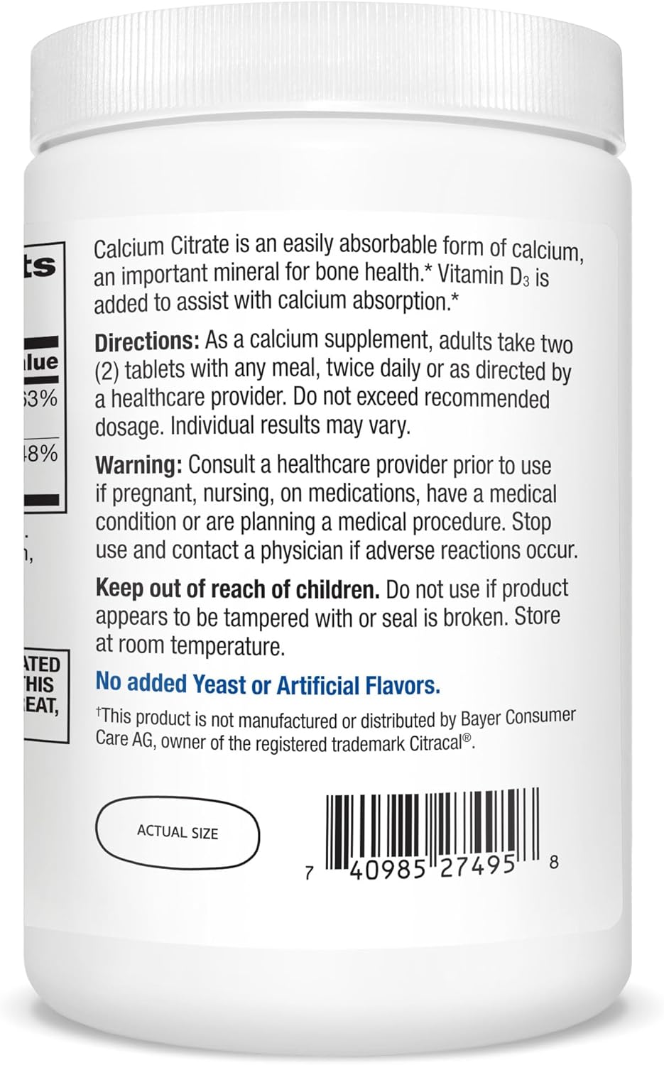 Highly Absorbable Calcium: Each tablet contains calcium citrate, a form of calcium known for its high bioavailability and absorption rate, promoting strong bones and teeth.