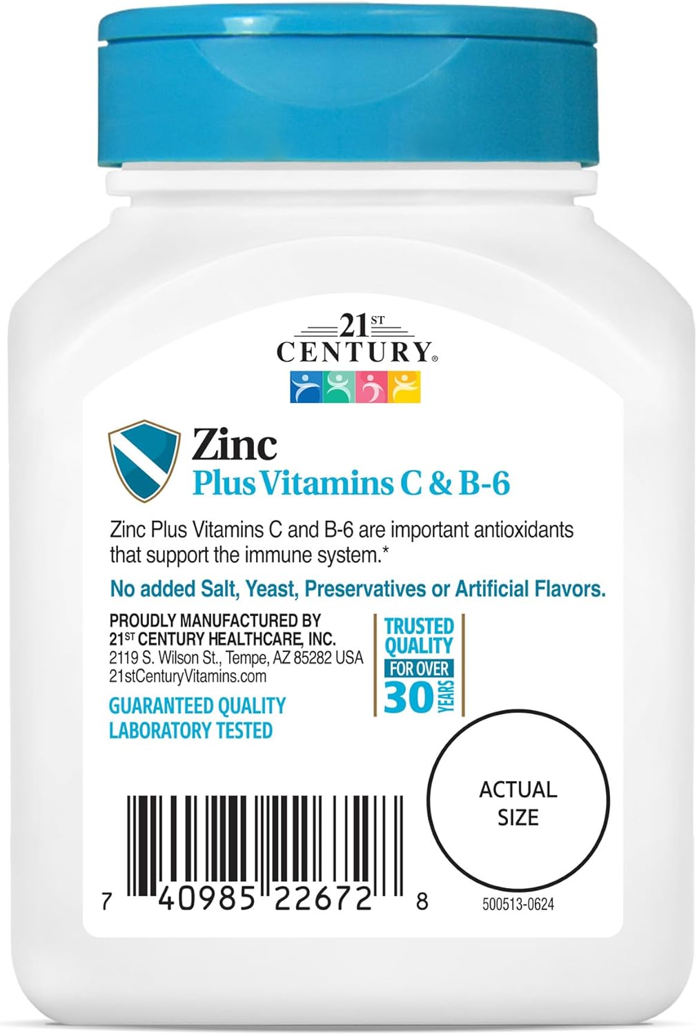 Package Quantity: 1 21st Century zinc chewable aids in carbohydrate metabolism and assimilation of nutrients. Zinc an antioxidant nutrient helps to maintain normal cell growth and development. Zinc Vitamin C and B-6 also support the immune system.