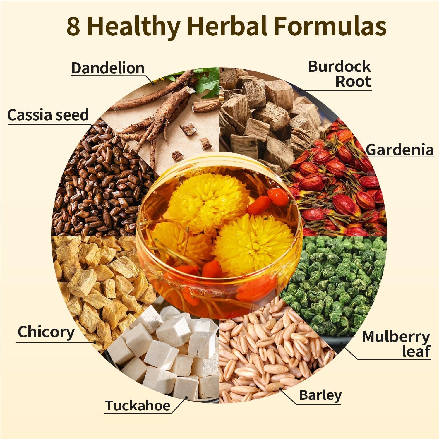 【Detox & Vitality Boost】Chicory and dandelion work in synergy to support liver and kidney detoxification, while cassia seed’s antioxidants help protect eyes from digital strain. Gardenia contains natural compounds that promote stress reduction, and mulberry leaves contribute to healthy glucose metabolism.