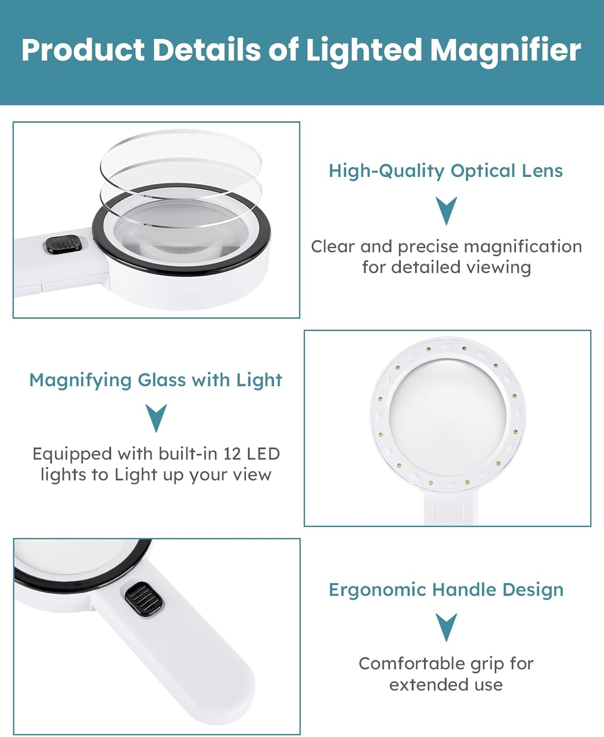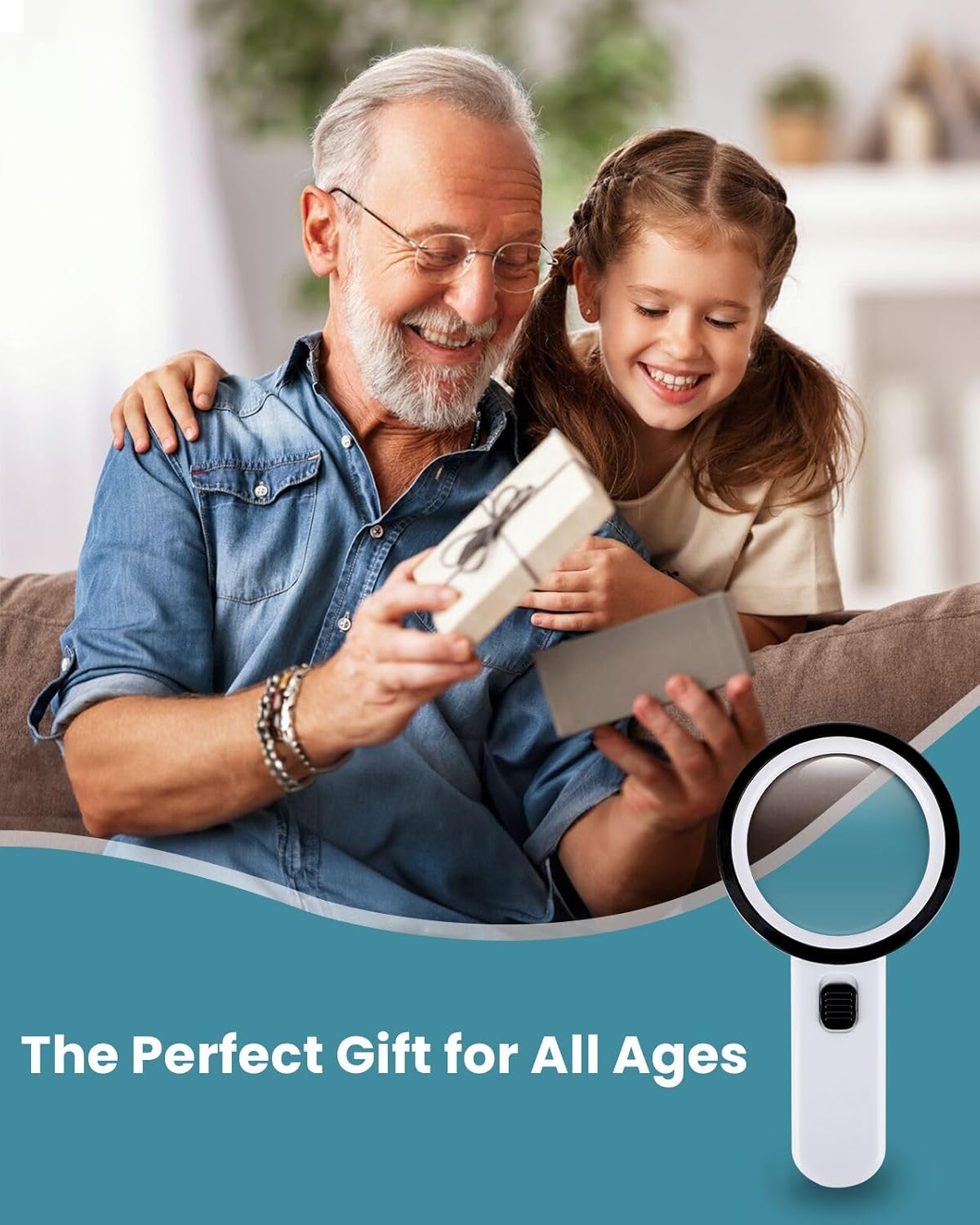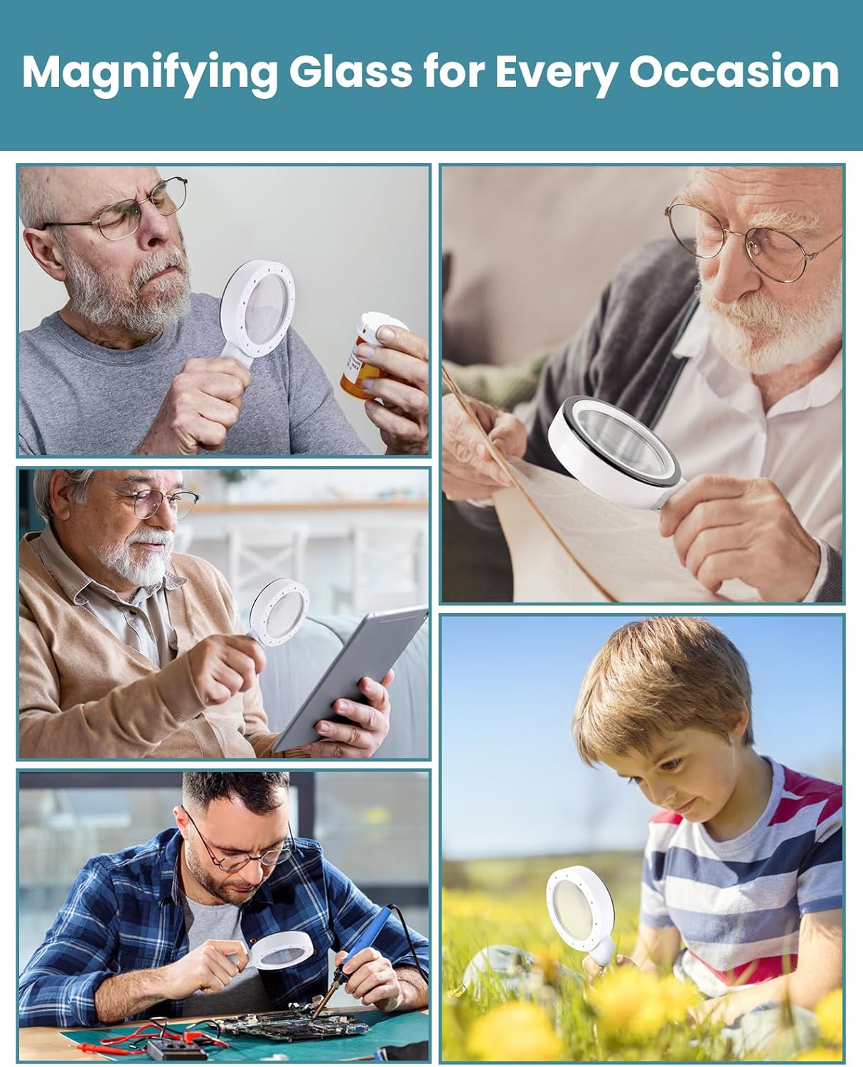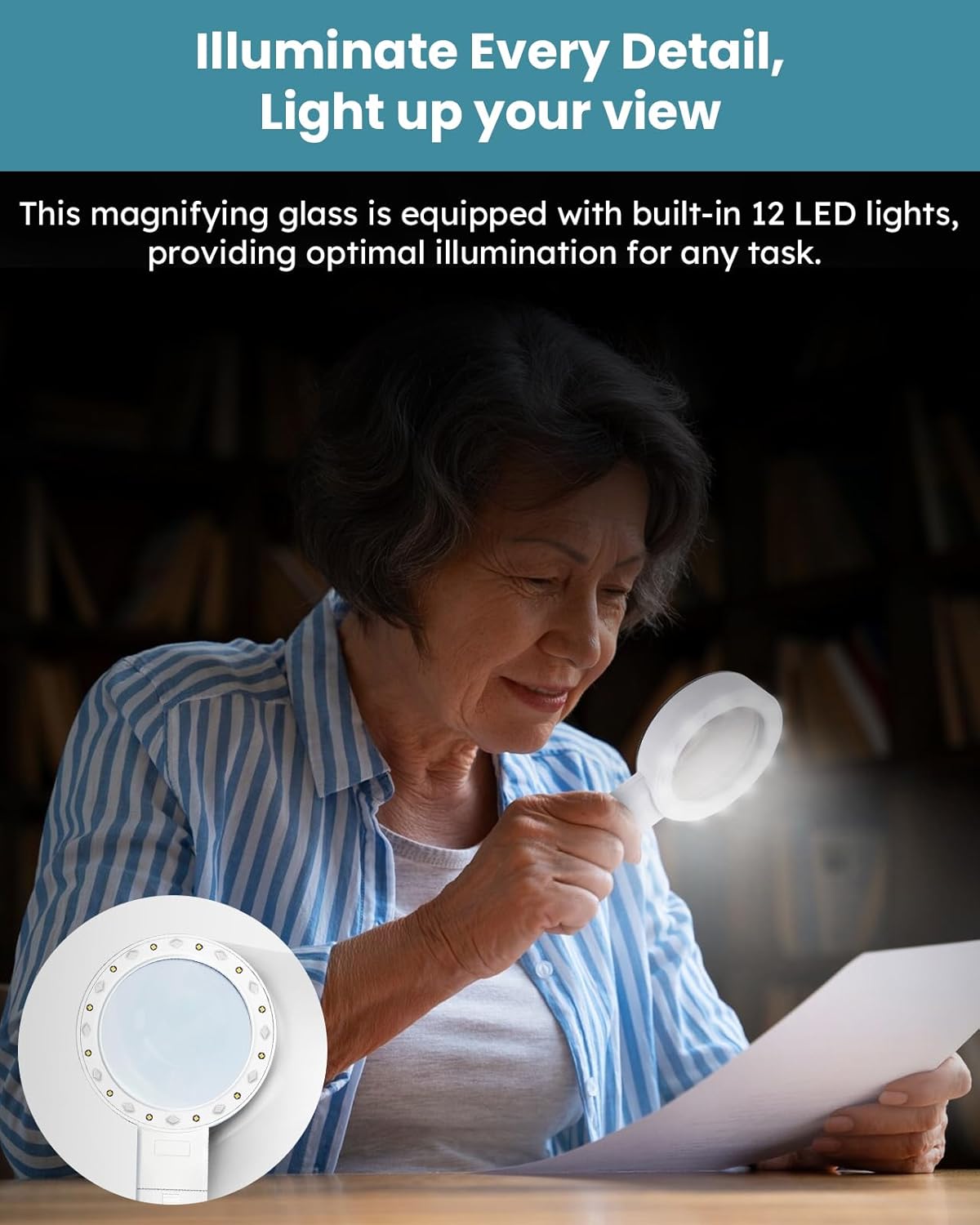 【Excellent Lighted Magnifying Glass】This magnifier features 12 ultra-bright LED lights. The LED lights are designed to provide comfortable reading in the dark without straining the eyes. With this magnifier with light, users can enjoy extended reading sessions without discomfort. The healthy LED lights ensure that you can read for long periods without experiencing eye fatigue, making it a great magnifying glass for reading, especially in low-light conditions