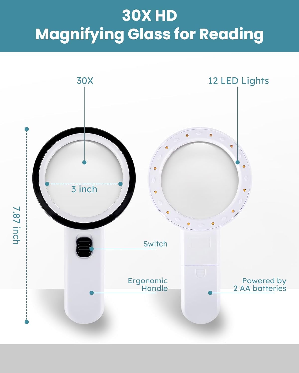30X Magnifying Glass with Light, Handheld Magnifier Lighted Magnifying Glass with 12 LED Light, Ideal Gift for Seniors, Macular Degeneration, Low Visions Inspection Coins Jewelry