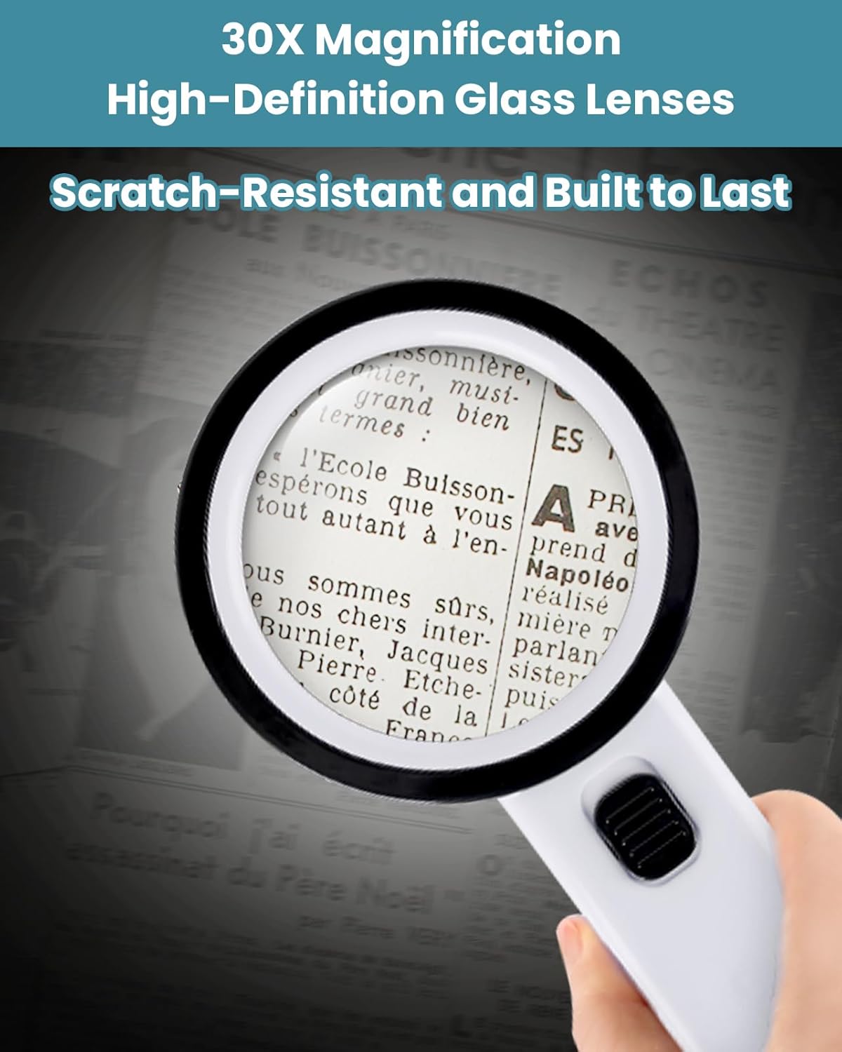 【High Power Magnification】This magnifying glass offers high-power magnification with double glass lenses, making the magnifier the perfect tool for the elderly and those with low vision to read easily and clearly. This magnifying glass with light provides a 30x magnification effect, ensuring even the finest details in newspapers, documents, and maps are visible. Whether you’re examining stamps, coins, electronic parts, or jewelry, this lighted magnifier is the ideal accessory