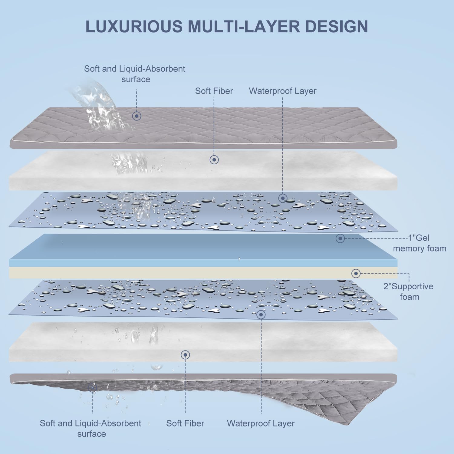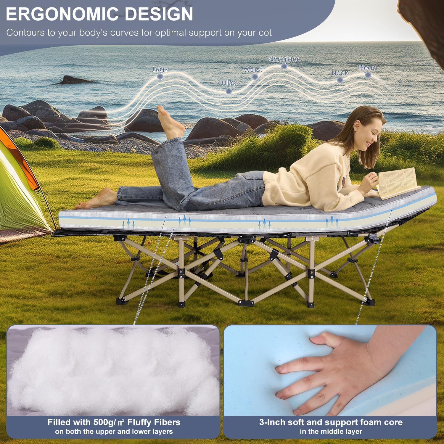 【Luxurious Multi-Layer Design Camping Mattress Pad】Featuring a 0.5-inch quilted breathable pillow top mattress topper on both the top and bottom, this mattress has a 3-inch thick foam core that combines 1 inch of memory foam with 2 inches of high-density support foam. A waterproof layer protects the foam, preventing direct contact with the ground and ensuring full-body comfort even on wet surfaces