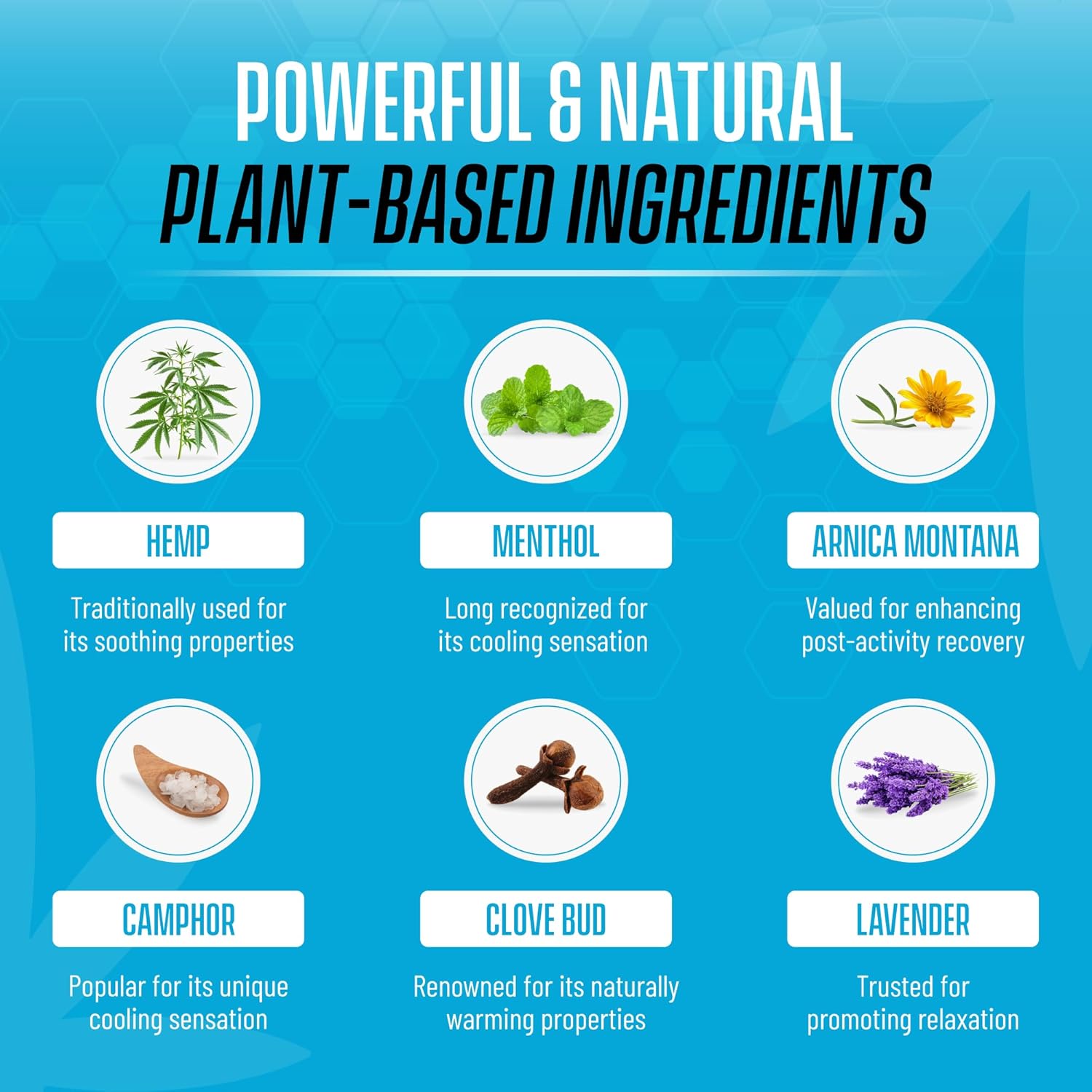 Natural Plant Based Ingredients: Hemp Seed Oil, Coconut Oil, Candelilla Wax, Shea Butter, Menthol, Arnica Montana, Essential Oils (Lavender, Rosemary, Peppermint, Marjoram, Eucalyptus, Camphor, Clove Bud, Black Pepper) work together to assist with athletic recovery while also moisturizing skin.