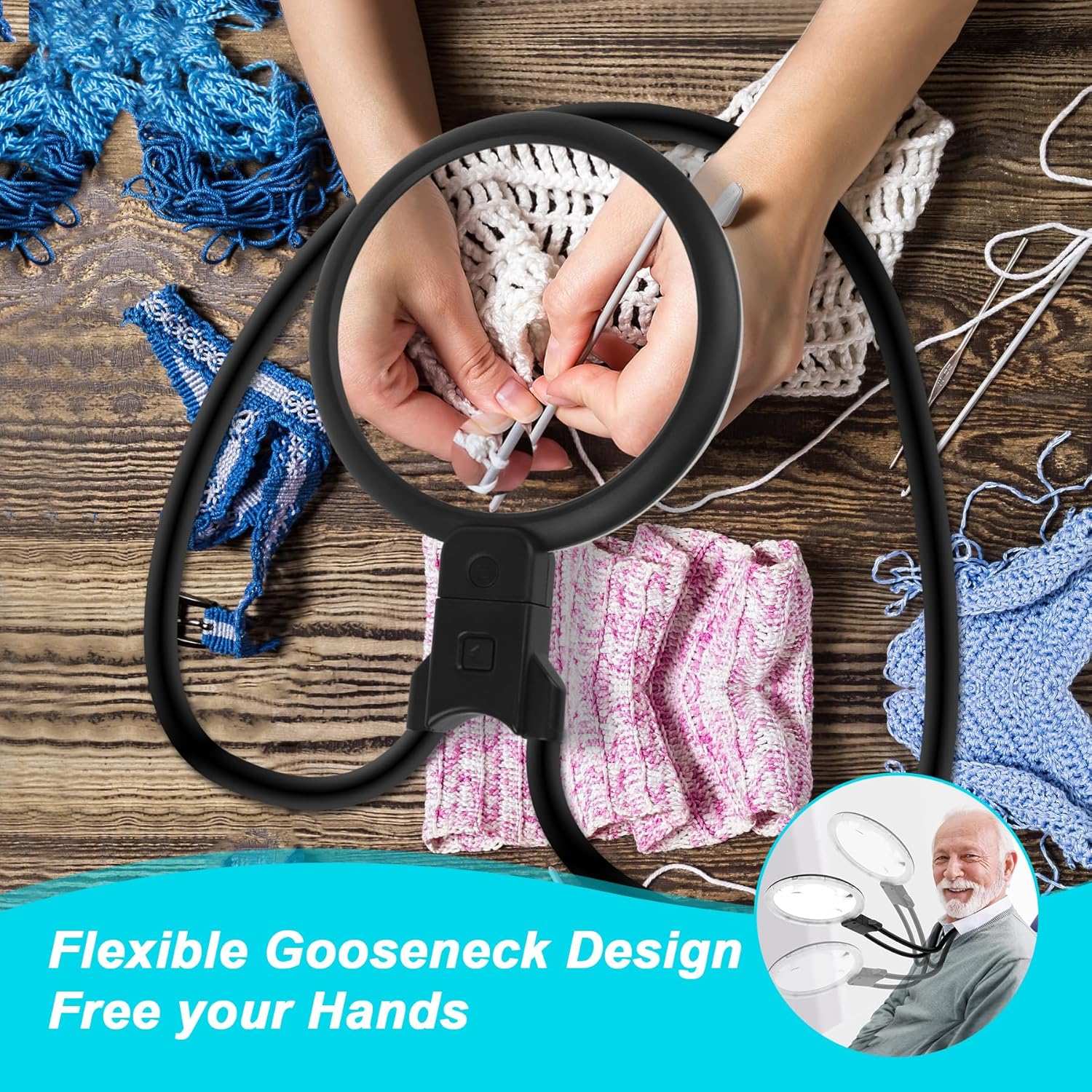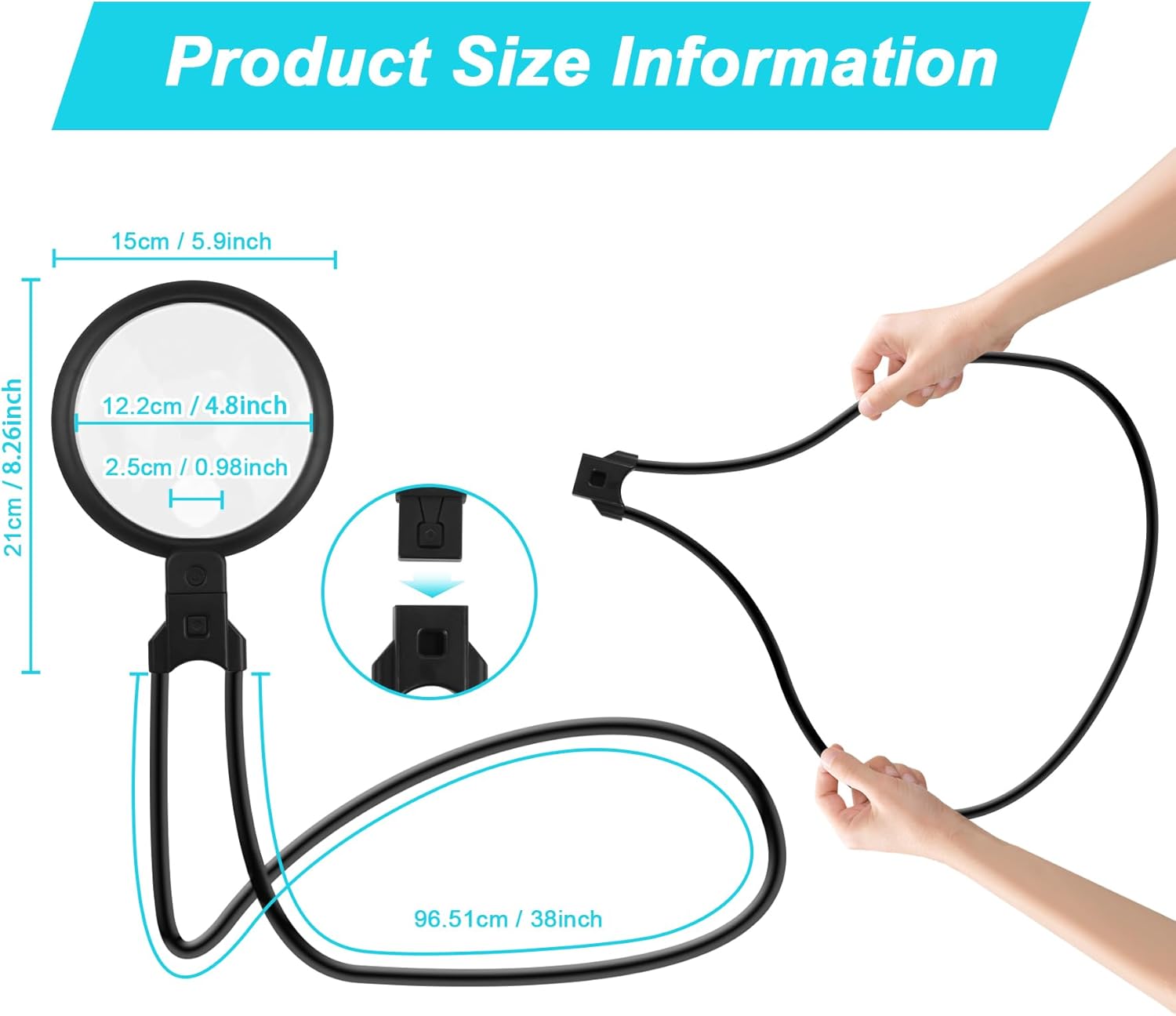 The gooseneck can be tilted and twisted to any direction and angle you are comfortable with. the around neck hanging magnifying glass can free your hands, say goodbye to arm pain and improve comfort