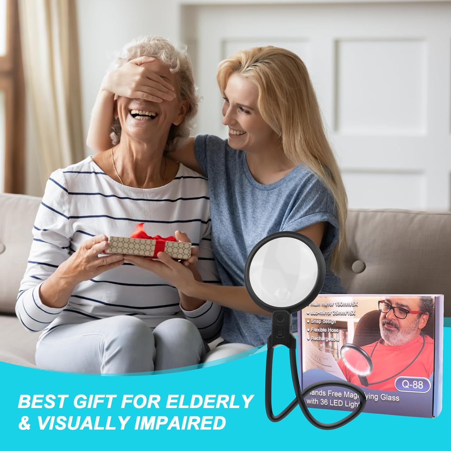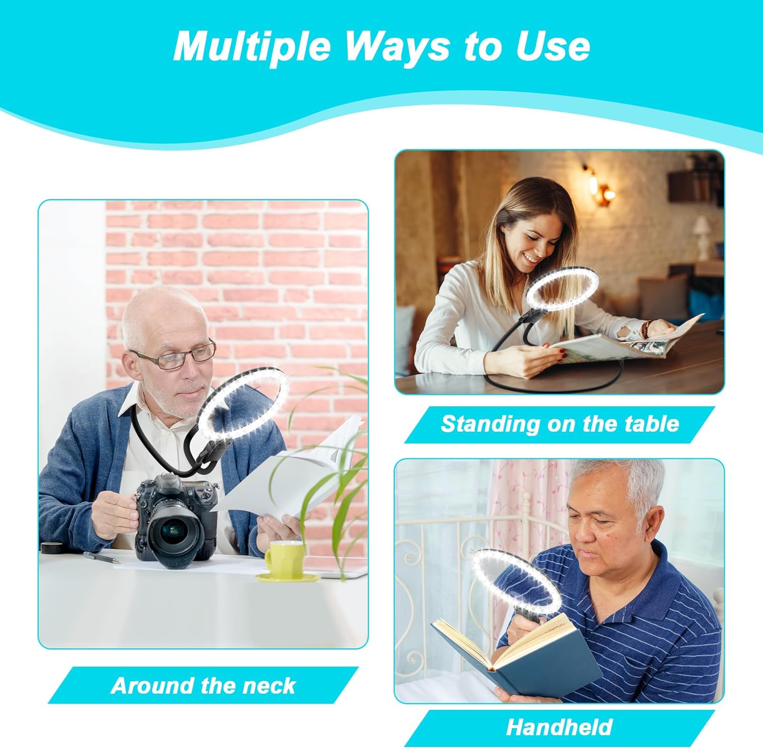 3-in-1 Magnifying Glass:This magnifying glass offers three convenient usage options,hang it around your neck for hands-free use, place it on a table for stability, or utilize the flexible gooseneck for handheld precision. Perfect for daily life and work, this multifunctional tool adapts to your needs effortlessly, making it an essential accessory for reading, crafting, and detailed tasks
