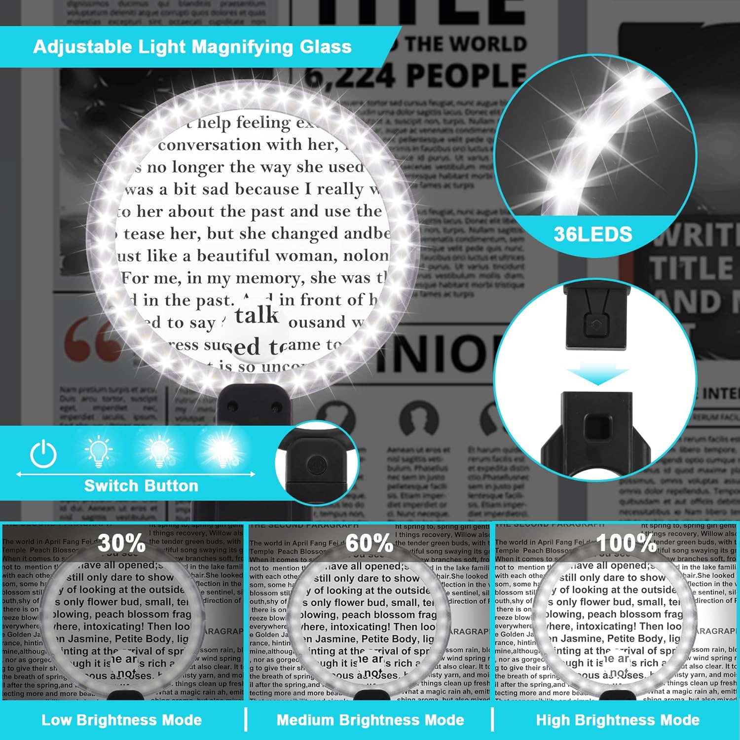 36 LED Lights:Featuring 36 energy efficient LED lights, this magnifier provides three adjustable brightness levels to suit various lighting conditions. Whether you’re working in low light or need extra illumination, the bright and even lighting reduces eye strain, making it ideal for extended use