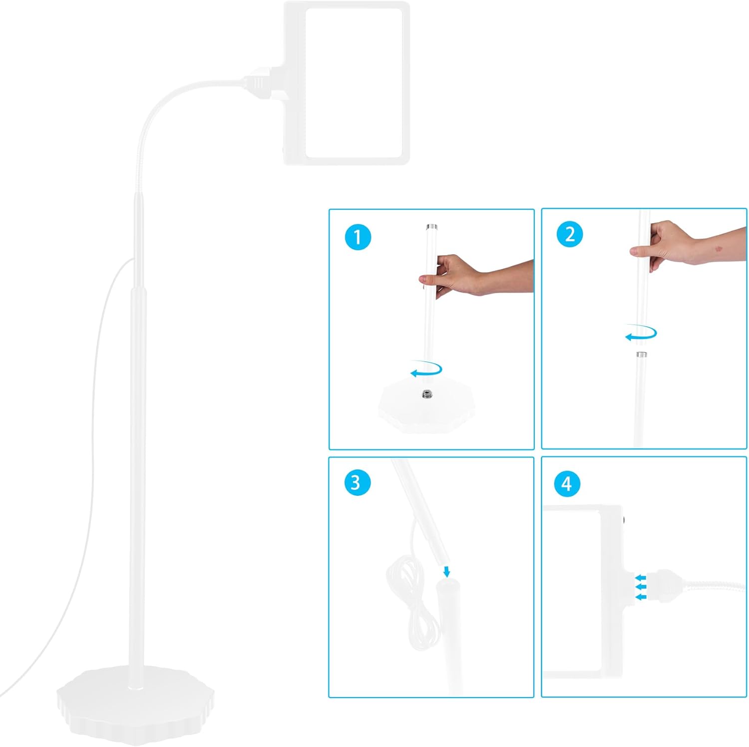 Magnifying Floor Lamp 3-in-1: You can use it as a floor-standing magnifying glass with a light. 10-inch heavy metal base provides stability to the product; the detachable metal pole can be freely combined at two different heights without the need for tools. Moreover, it can be used separately as a handheld magnifying glass, making it the best choice for seniors reading, close-range work, electronic repairs, beading, and painting