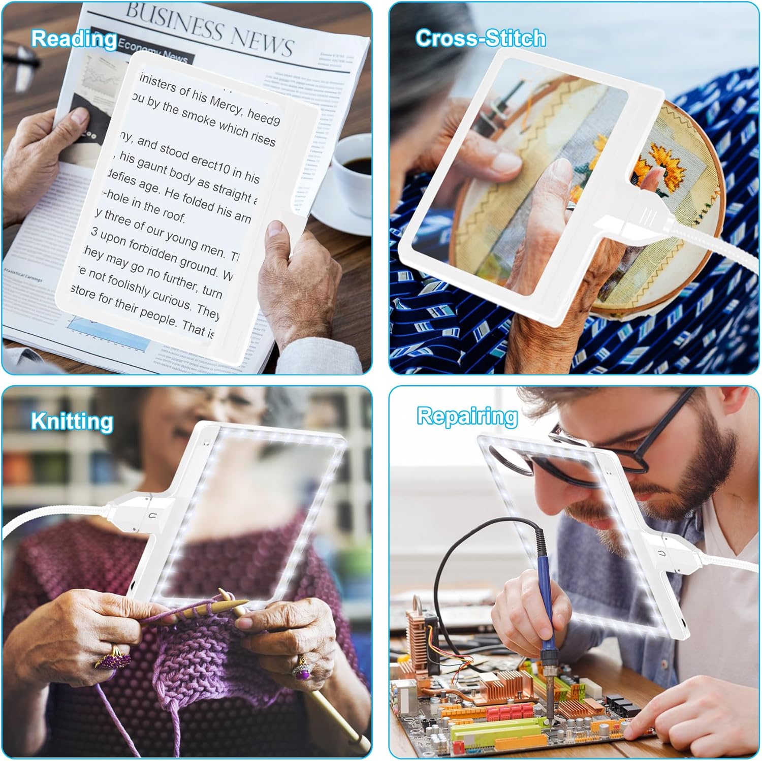 Large Magnifying Glass for Reading: This large magnifier with light is 8 x 6 inches in size, providing you a larger view area without repeatedly moving the magnifying glass. 5X high-definition zoom-in 500% of the area without distortion, good for reading book