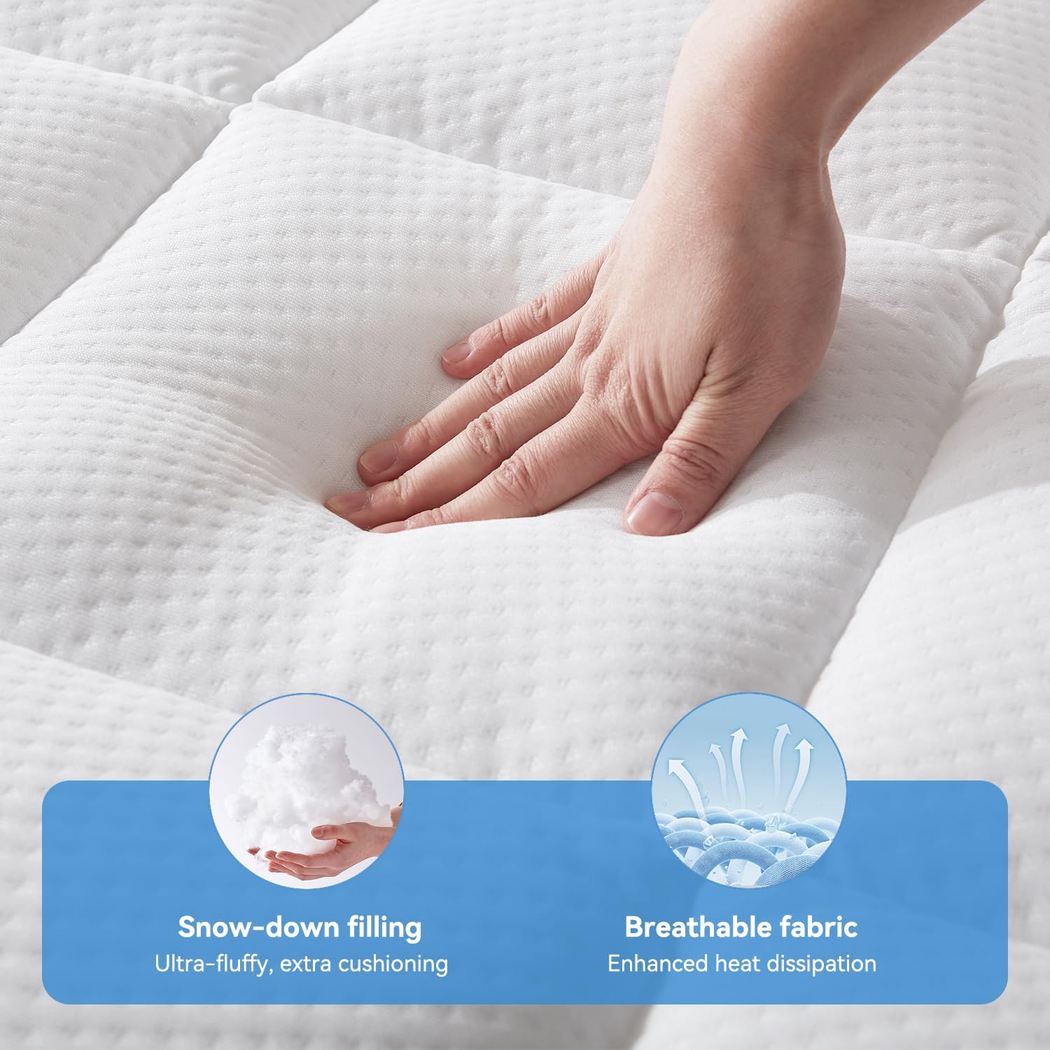 [Fluffy Cushioning] The pillowtop layer is filled with premium 3D snow down alternative fiber, delivering exceptional plushness and cloud-like comfort. This extra cushioning gently contours to your body, reducing pressure points for a more relaxing sleep experience.