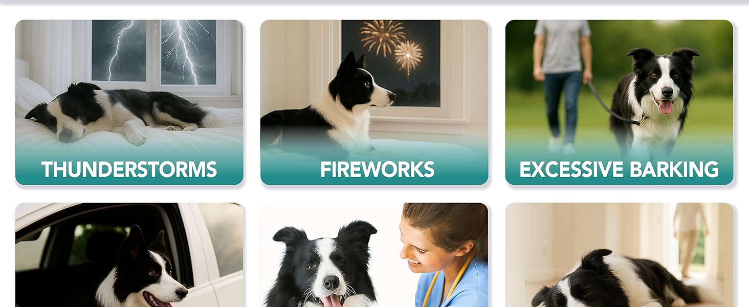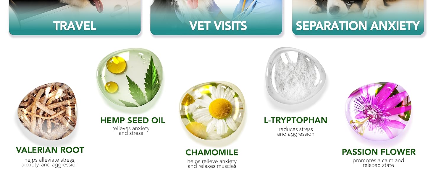 Relieve Anxiety and Stress: Our calming dog treats alleviate symptoms of anxiety and stressful situations like growling, barking, scratching, separation, car rides, vet visits, thunderstorms