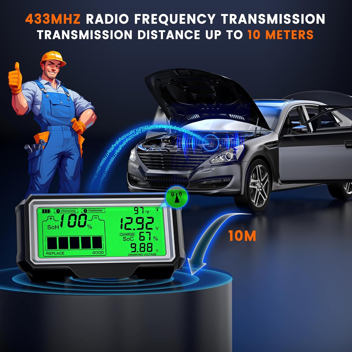 ✅Easy Operation And Battery Health Status Indicator: You only need to connect the negative (black) connector firmly to the negative battery port and the positive (red) connector firmly to the positive battery port. Place the LCD display in front of the windshield to view battery health data such as: voltage, power percentage, temperature, charging system test, starting system test, health percentage, etc. Battery status can also be displayed by the 9 LED light on top of the wireless host unit.