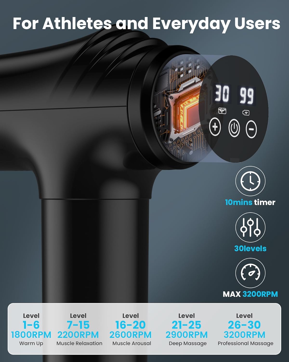 TAILORED TO YOUR TOUCH: Choose from 30 customizable speeds and a smart 10-minute timer for massage gun to personalize every session; Gentle enough for sensitive areas, powerful enough for deep knots—all while preventing overuse with automatic safety shut-off