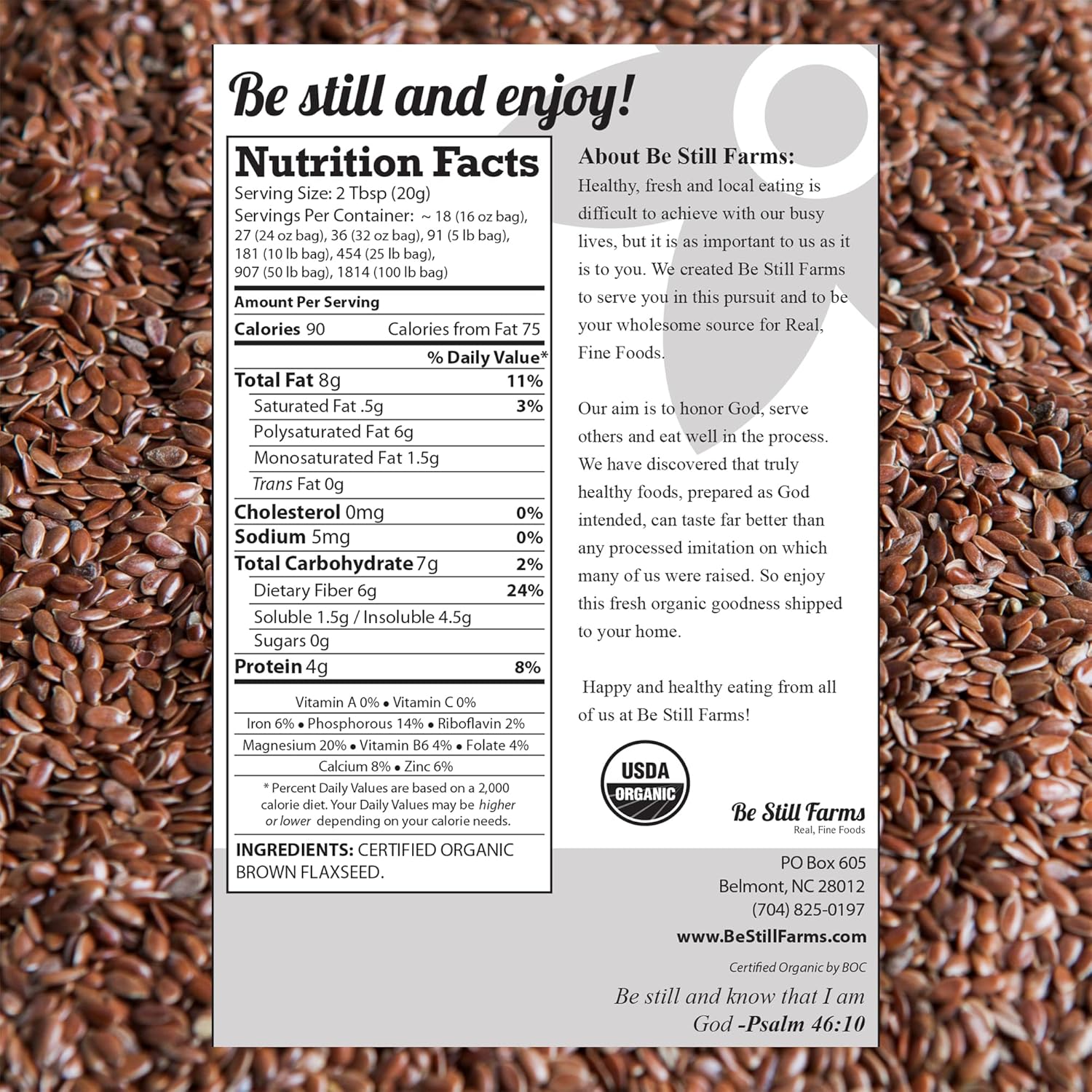 PRODUCT OF USA: We are proud to serve the highest quality ingredients directly from our independent, family-owned business in North Carolina; Our Brown Flax Seeds are grown and harvested using sustainable and organic practices