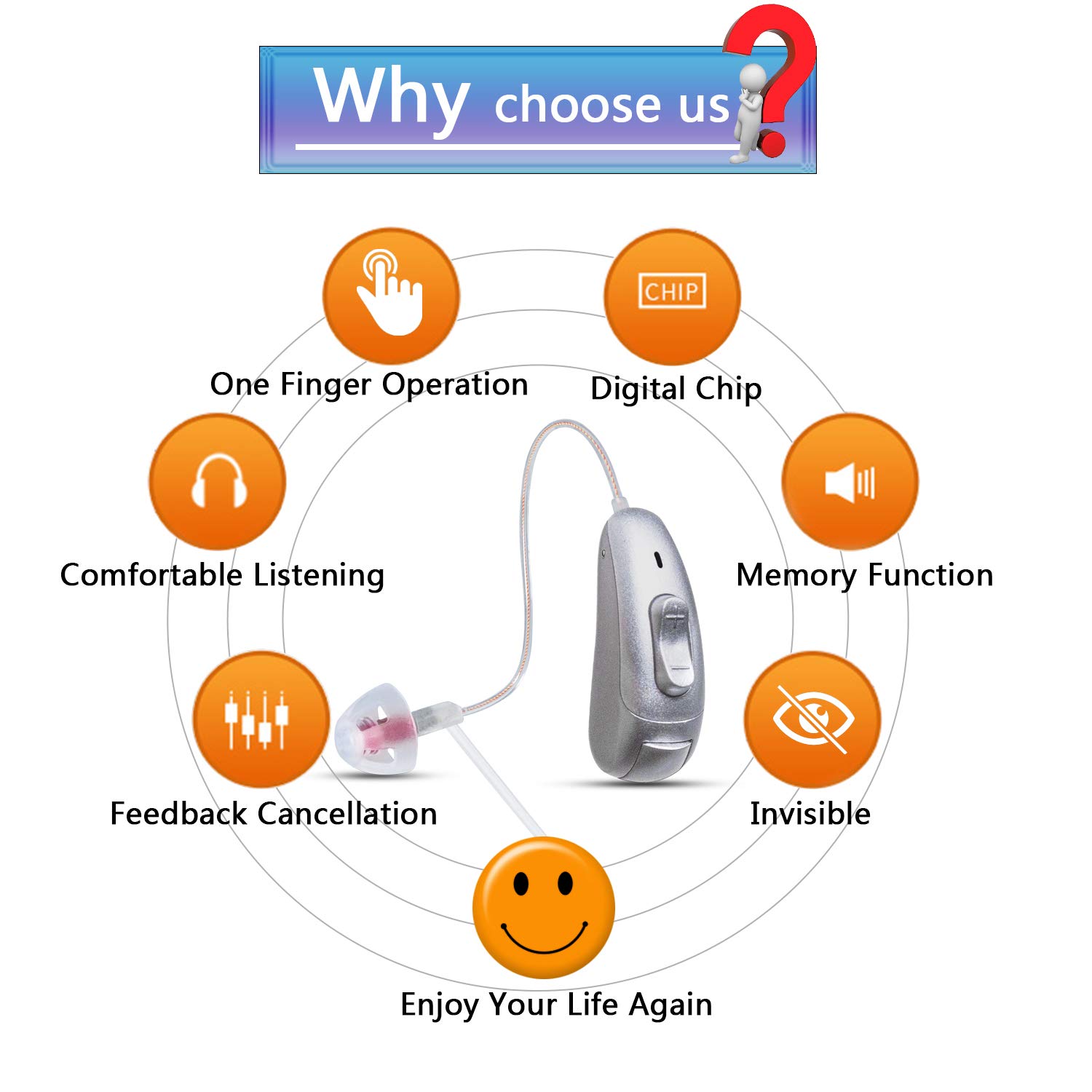 A BETTER DESIGN: 6 Channels digital processor, layered noise reduction, provide you with high quality sound. The receiver is tucked all the way down inside your ear canal, while the microphone sits behind your ear. This design can greatly reduce the chance of feedback.