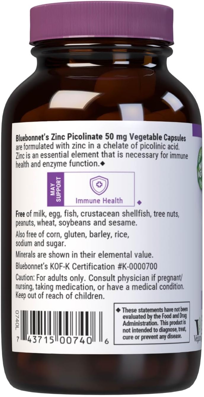 Bluebonnet Nutrition Zinc Picolinate 50 mg Vegetable Capsules, Best for Hormonal & Immune Health, Prostate Health, Skin, Vegan, Non GMO, Gluten Free, Soy Free, Milk Free, Kosher, 100 Vegetable Capsule
