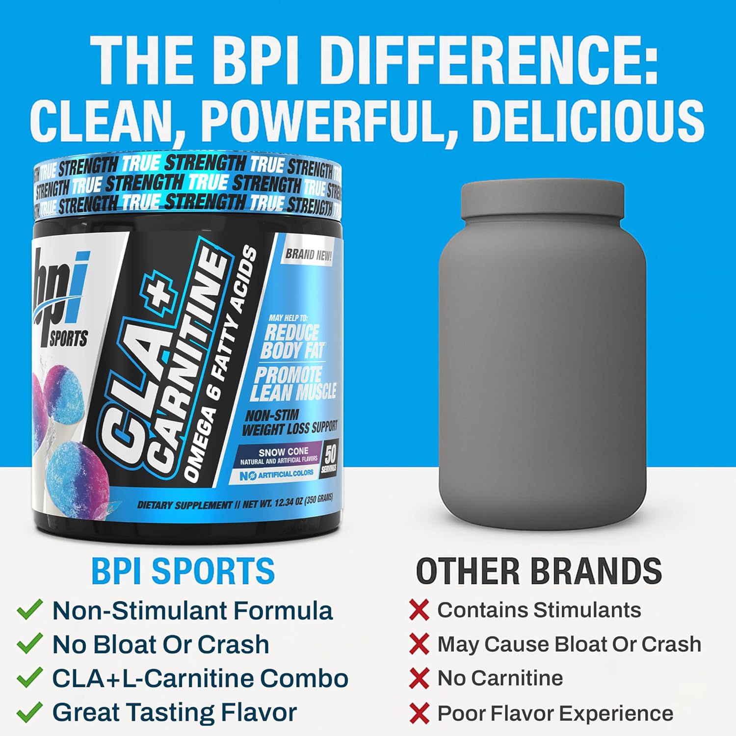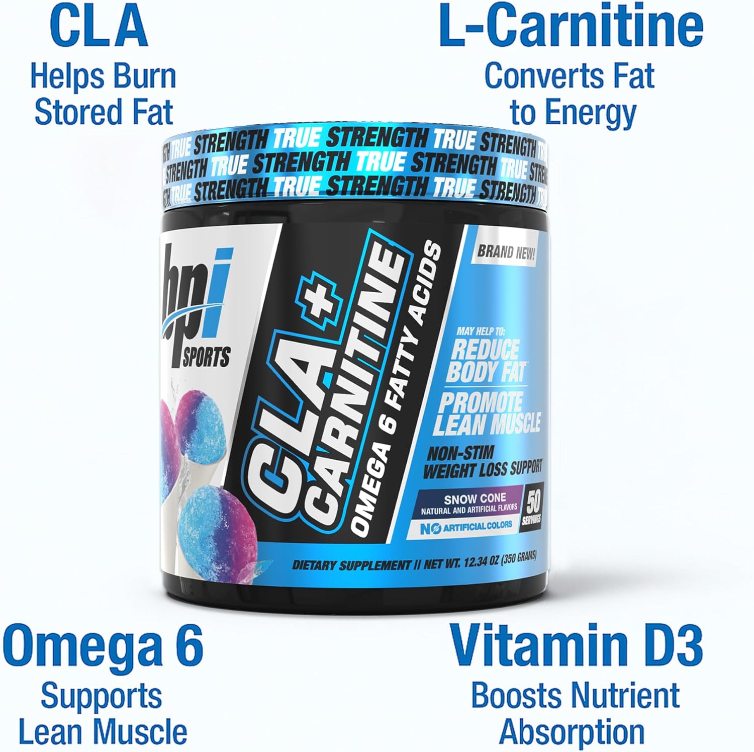 BPI Sports CLA+Carnitine – CLA L Carnitine & Linoleic Acid – L Carnitine Supplement for Weight Loss, Metabolism & Lean Muscle – Caffeine Free – Snow Cone – 50 Servings – 12.34 oz