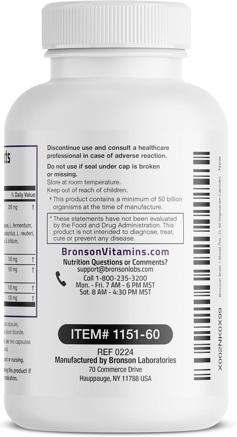 Bronson’s Brain + Mood Probiotic 50 Billion CFU Plus Prebiotic provides 16 freeze dried strains for immune, digestive, brain, and positive mood support.* Freeze drying technology enables preservation, stability, and superior quality by allowing many more beneficial bacteria to survive compared to other processes. Our Brain + Mood Probiotic additionally provides L-Theanine, Bacopa Monniera and Rhodiola Rosea to promote brain health and to help the body cope to the various stresses in daily life.* Our superior probiotic also includes Inulin Prebiotic fiber to support the growth of good bacteria.* Brain + Mood Probiotic 50 Billion CFU is Non-GMO, Gluten-Free and Soy-Free, manufactured at our state of the art cGMP Registered New York Facility.