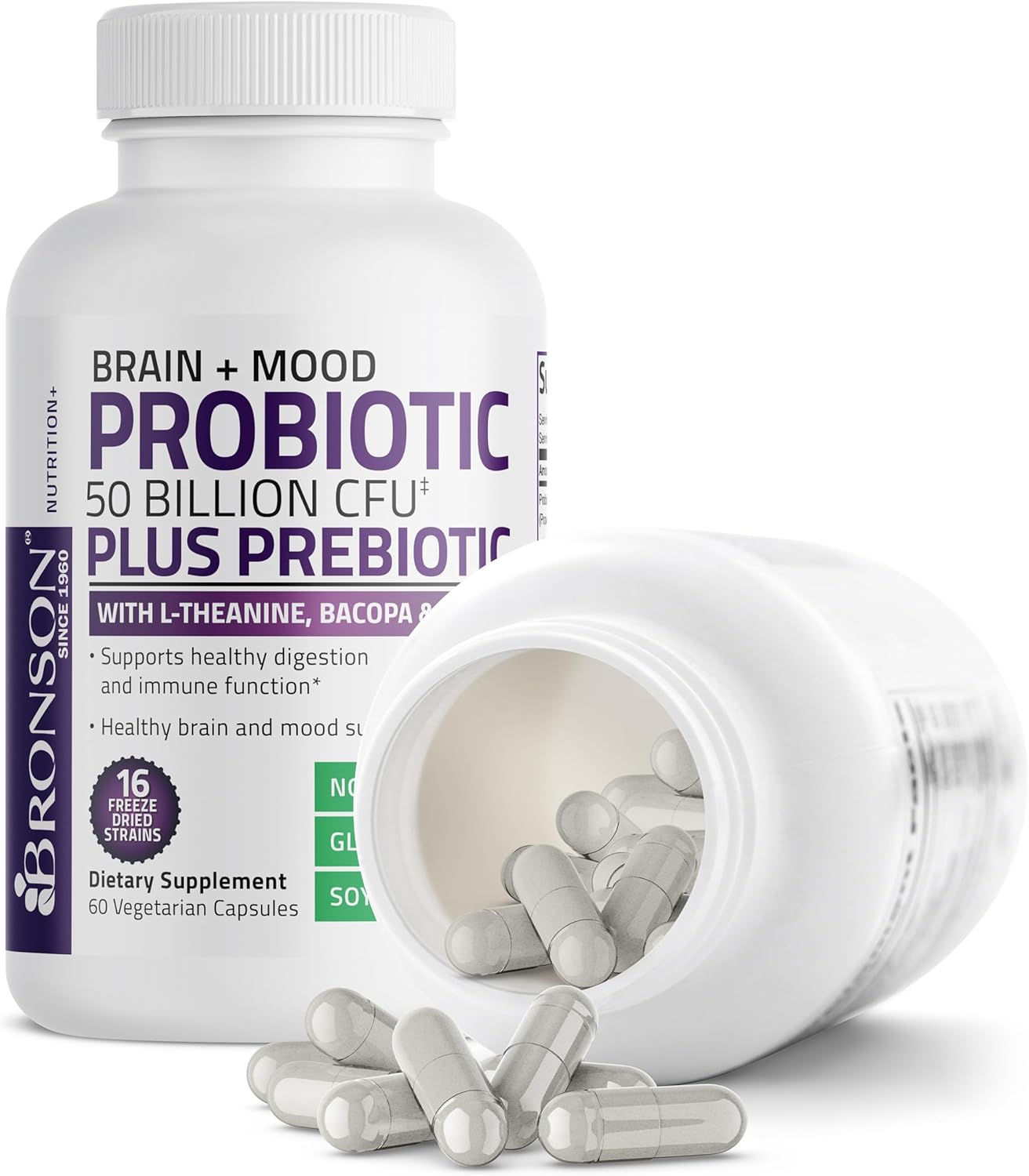 Bronson Brain + Mood Probiotic 50 Billion CFU Plus Prebiotic with L-Theanine, Bacopa and Rhodiola Non-GMO, 60 Vegetarian Capsules