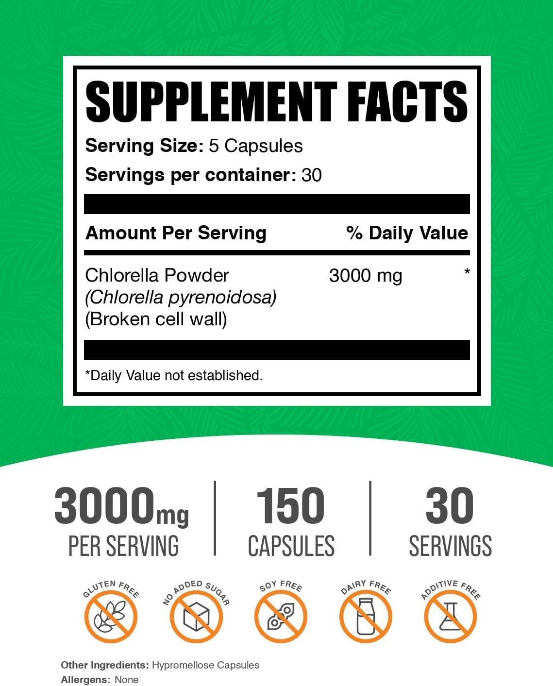 BulkSupplements.com Chlorella Capsules – Broken Cell Wall, Chlorella Supplement – Superfood Supplement, Vegan & Gluten Free, 5 Capsules per Serving, 150 Count (Pack of 1)
