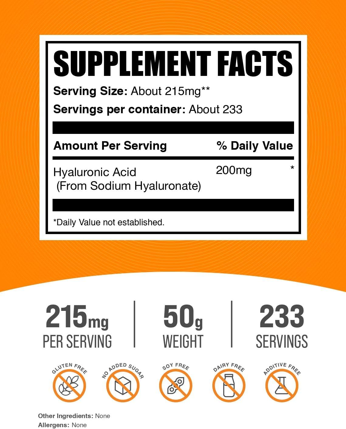 BulkSupplements.com Hyaluronic Acid Powder – as Sodium Hyaluronate, Hyaluronic Acid Supplements – Food Grade, Gluten Free – 215mg per Serving, 50g (1.8 oz) (Pack of 1)
