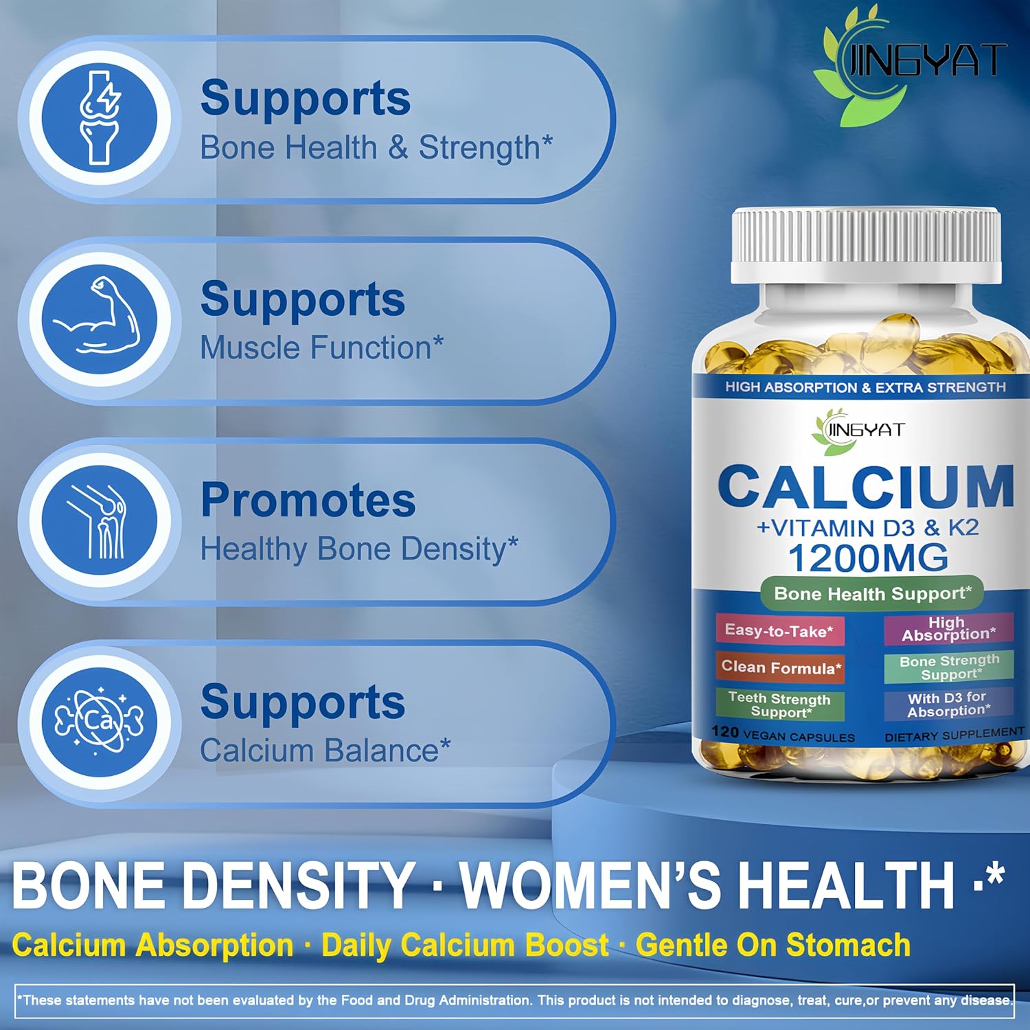 Calcium 1200mg & Vitamin D3+K2: Support your bone health with our 1200mg Calcium Supplement for Women. Powered by Calcium Citrate for optimal absorption, each serving helps strengthen and maintain healthy bones. Vitamin D3 enhances calcium absorption, while Vitamin K2 ensures calcium is directed to your bones where it’s needed. Stay strong with essential Calcium with Vitamin D3 support.