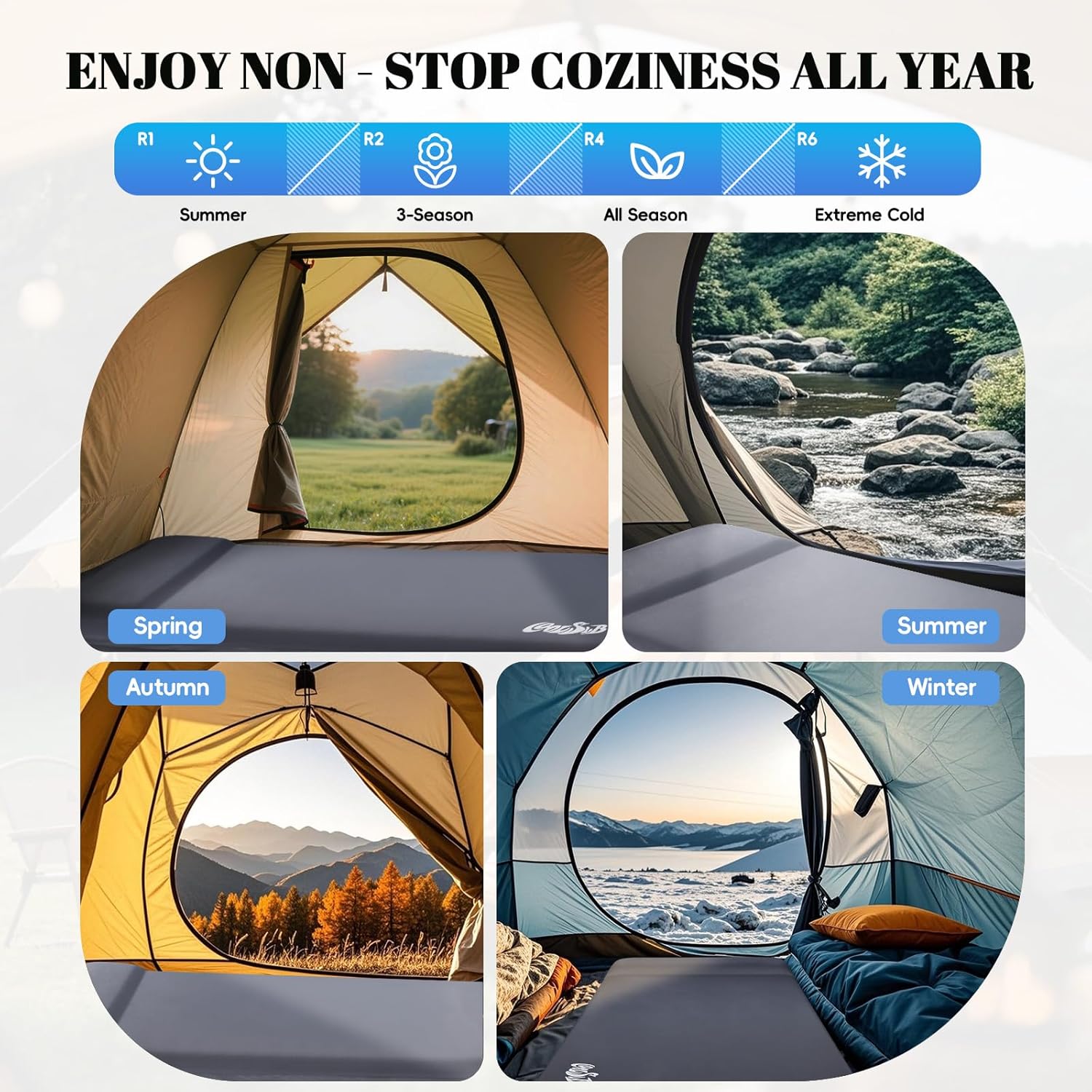 【SLEEPING PAD SUITABLE ALL SEASONS】Our sleeping mat camping with R-value of 9.5 and the Self-inflatable camping mats made of this material have excellent heat insulation, moisture-proof and breathable properties. It can adapt to both hot and cold environments, so it can be used in all four seasons. Break through the seasonal limitations for your travel. Prefect for car trips, tent camping and family storage of temporary mattresses.
