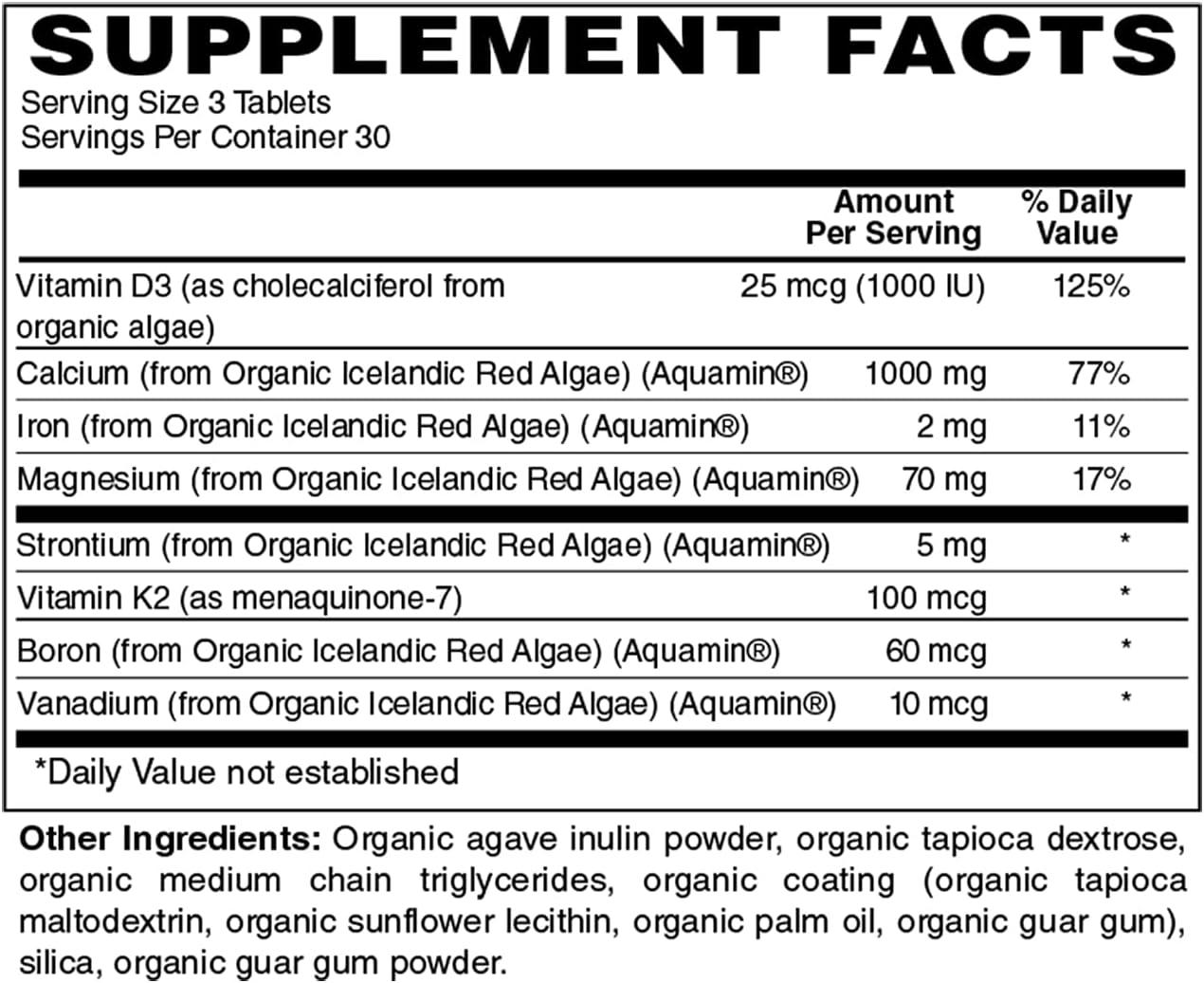 1,000mg Algae Calcium per serving, featuring Aquamin; a premium, trademarked source of Icelandic mineralized red algae.