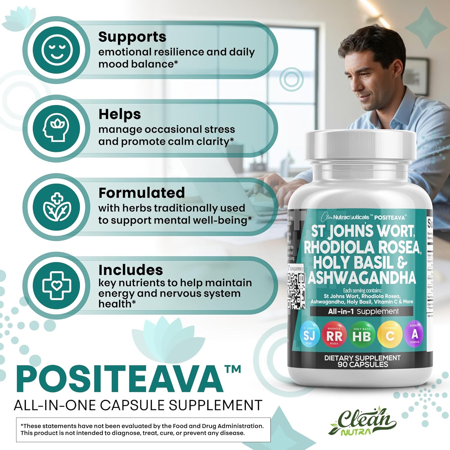 The Ultimate St. Johns Wort Capsules & Ashwagandha Capsules You’ve Been Looking For – Clean Nutra Positeava provides 4 full-dose products in one support complex containing a full St Johns Wart, Rhodiola Rosea Supplement, Ashwagandha Pills, and Holy Basil Leaf. in a convenient 3 capsule dosage. Finally Saint Johns Wort Capsules, Rhodiola Extract Capsules and an Ashwagandha Supplement have been packed into one simple solution.