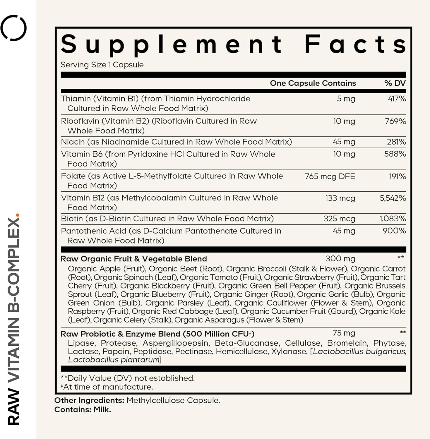 This vitamin B supplement in capsules formula is further enriched with a raw organic fruit & vegetable blend, featuring a diverse array of nutrient-dense ingredients such as apple, beet, blackberry, broccoli, carrot, spinach, strawberry, tart cherry, tomato, and more, providing an additional source of vitamins and minerals to complement the B-complex.