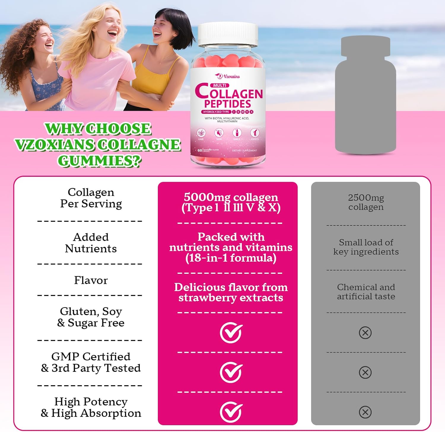 Collagen Peptides Gummies 5000MG, Collagen Gummies for Women & Men, Type I,II,III,V,X Protein with Biotin, Hyaluronic Acid, Vitamin C for Healthy Skin | Strawberry Flavored, Sugar Free, 120 Cts