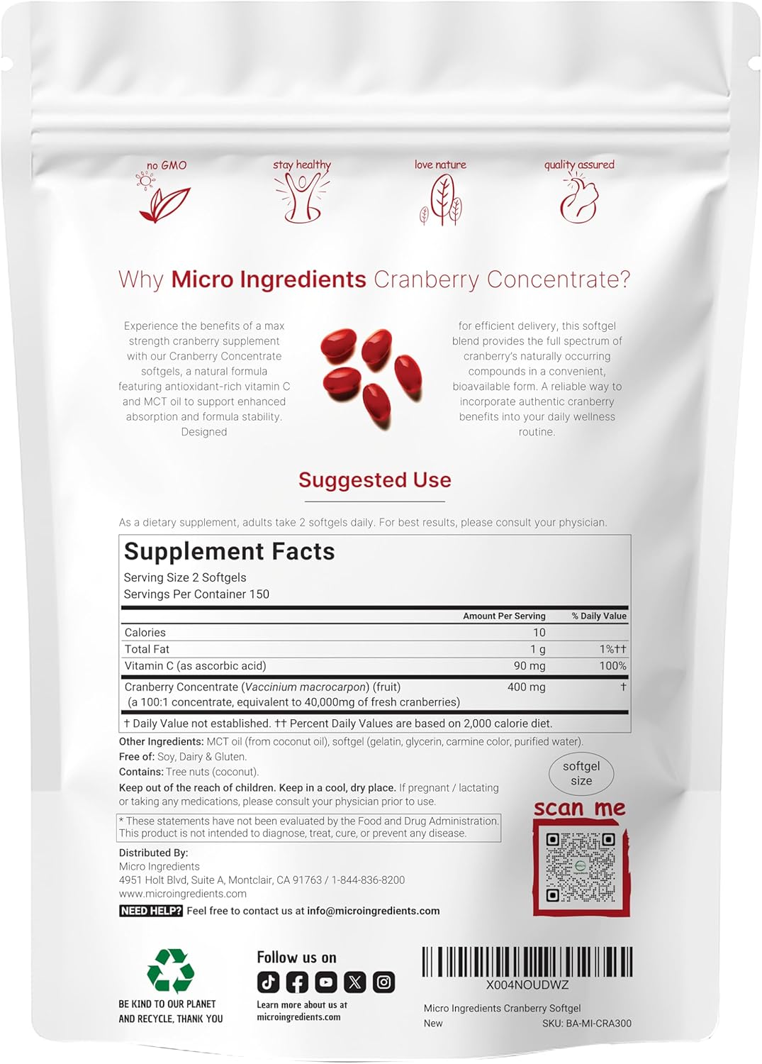 Micro Ingredients offers a max strength 2-in-1 blend of cranberry concentrate and antioxidant-rich vitamin C softgels, carefully formulated with healthy MCT oil from coconut to support enhanced absorption and formula stability.