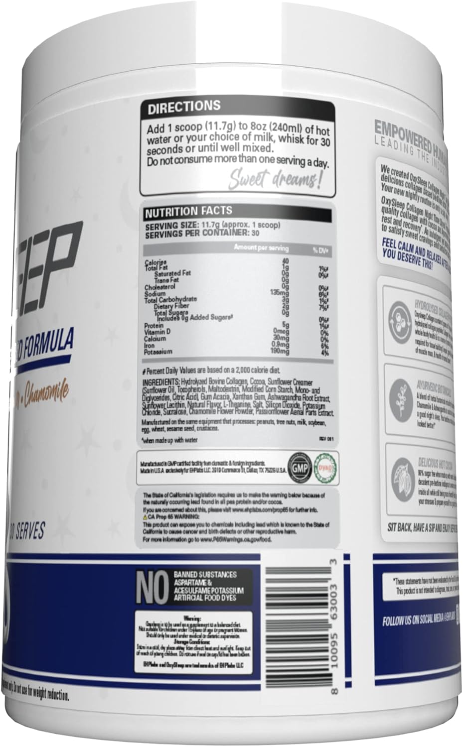 EHP Labs OxySleep Collagen Peptides Powder Night Time Shred – Promotes Deep Sleep & Shredding, Skin, Bones & Muscle Support, Pasture-Raised Bovine Collagen, Type I & III, 30 Servings (Hot Cocoa)