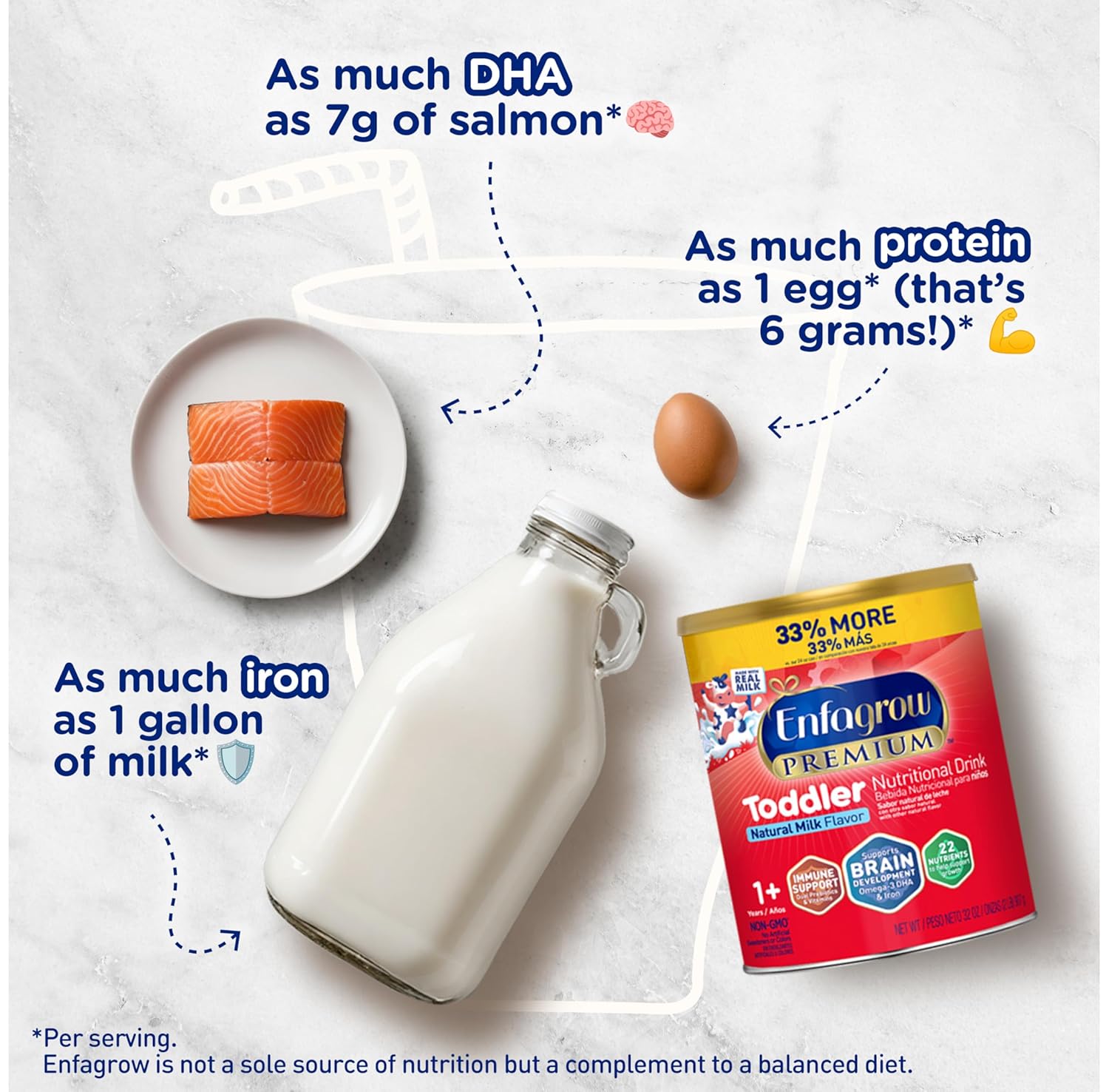 Enfagrow PREMIUM Toddler Nutritional Drink, Made with Real Milk, Brain-Building Omega-3 DHA, Nutrients and Prebiotics for Growth & Immune Support, Non-GMO, Toddler Milk Powder, 32 Oz Can, 6 Count