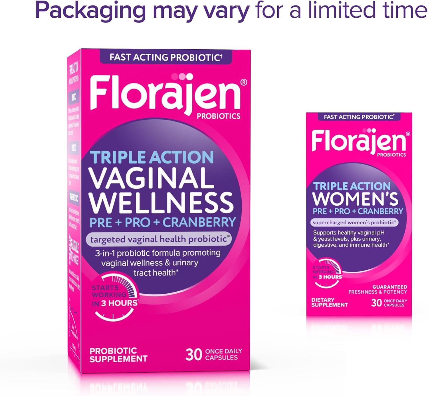 Florajen Women’s Triple-Action Probiotic – Prebiotic + Probiotic + Cranberry for Vaginal, Digestive, & Immune Support – Fast-Acting – Clinically-Studied – Gluten-Free & Vegan – 30-Count