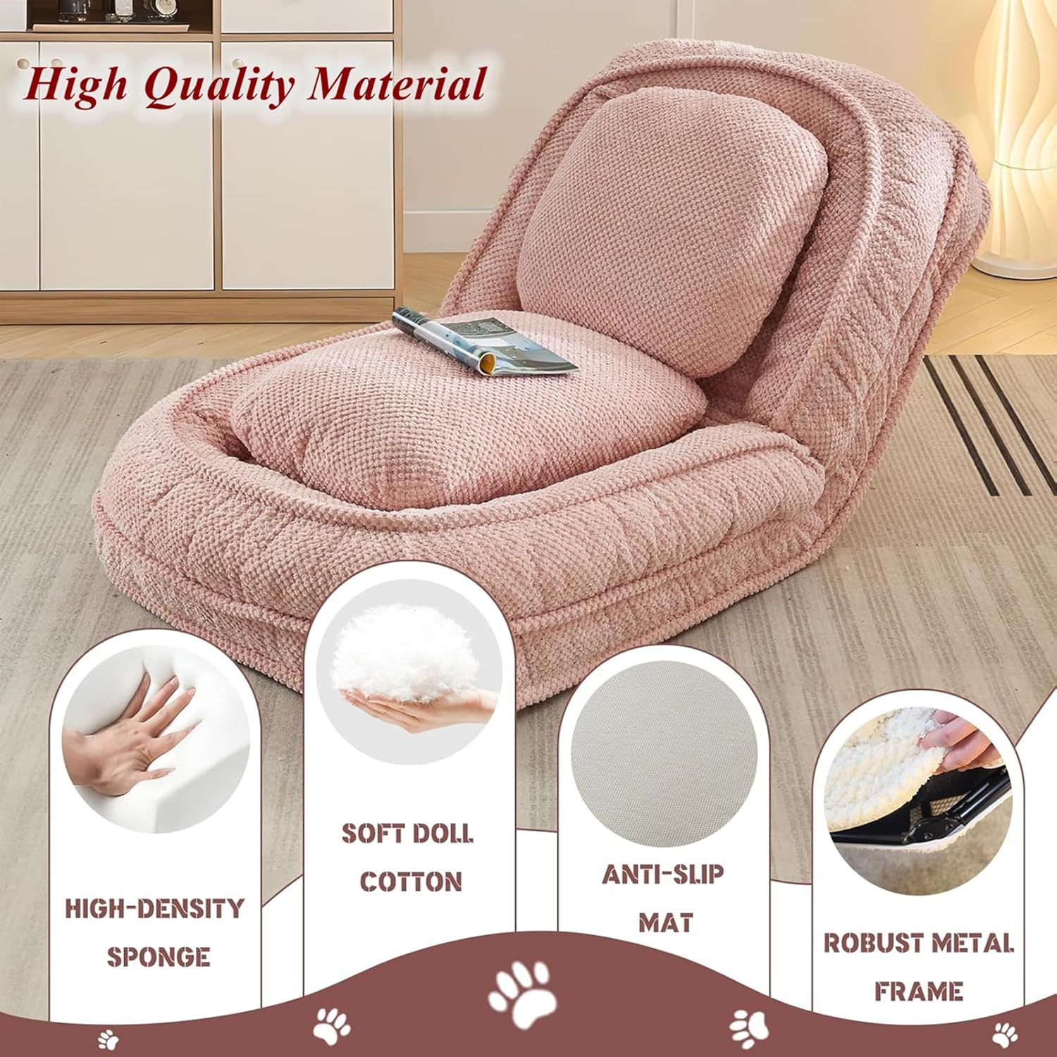 Foldable Lazy Sofa Bed, Comfy Upholstered Human Dog Bed for Adults & Pets, 2 in 1 Convertible Floor Sofa Chair with 5 Positions Adjustable Backrest and 2 Cushions (Pink)