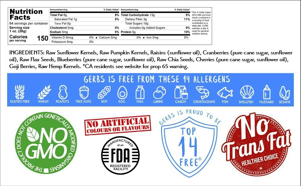 GERBS Superfood Snack Mix 4 LBS. | Top 14 Food Allergy Free | Bulk Bag | Made USA | Raw Pumpkin Sunflower Chia Hemp Brown Flax Seeds Dried Blueberries Cherries Cranberries Raisins Goji Berry Trail Mix